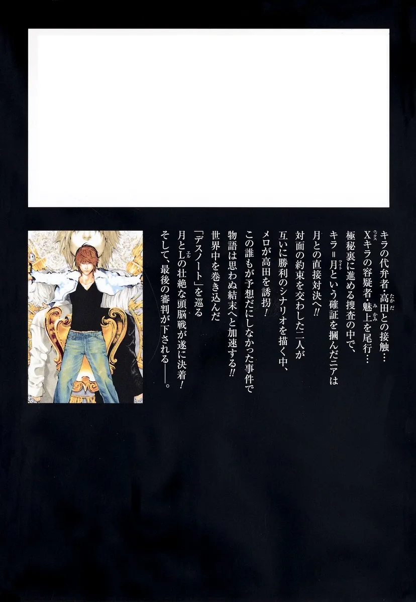 Контакт с Такадой, представителем Киры… Следуя за Миками, подозреваемым в деле X-Киры… В ходе своего сверхсекретного расследования Ниар получает неопровержимые доказательства того, что Кира — это Лайт, что приводит к прямой конфронтации с ним!! Когда они договариваются о встрече и каждый представляет свой собственный сценарий победы, Мелло похищает Такаду! Этот неожиданный инцидент ведет историю к непредсказуемому финалу!! Ожесточенная битва умов между Лайтом и L за «Тетрадь смерти», которая охватила весь мир, наконец подходит к концу! И затем выносится окончательный приговор──.