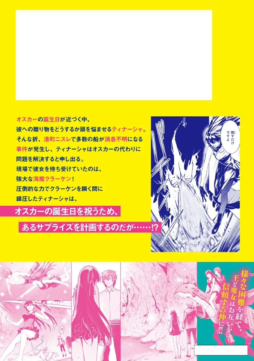 По мере приближения дня рождения Оскара ведьма Тинаша ломает голову, пытаясь решить, что ему подарить. В этот момент в портовом городе Нисле происходит инцидент, в результате которого пропадает множество кораблей, и Тинаша решает сама разгадать эту таинственную загадку. На месте происшествия ее ждет могучее морское чудовище, Кракен! Быстро усмирив Кракена своей подавляющей силой, Тинаша планирует сюрприз в честь дня рождения Оскара…!? Это девятый том комикс-адаптации легендарного веб-романа, который два года подряд занимал высокие места в категориях «Этот лайт-роман потрясающий!» (Takarajimasha) и был также экранизирован в виде аниме-сериала!