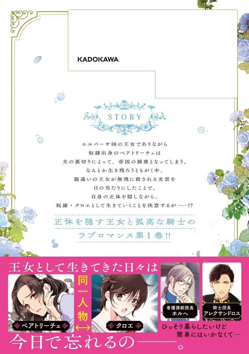 Беатрис, принцесса Эльпасы, родившаяся в рабстве, предана мужем и взята в плен Империей. Борясь за выживание, она становится свидетельницей жестокого убийства своей сводной сестры и решает жить как рабыня по имени Хлоя, скрывая свою истинную личность —!? Первый том этой любовной истории о принцессе, скрывающей свою истинную личность, и одиноком рыцаре! !