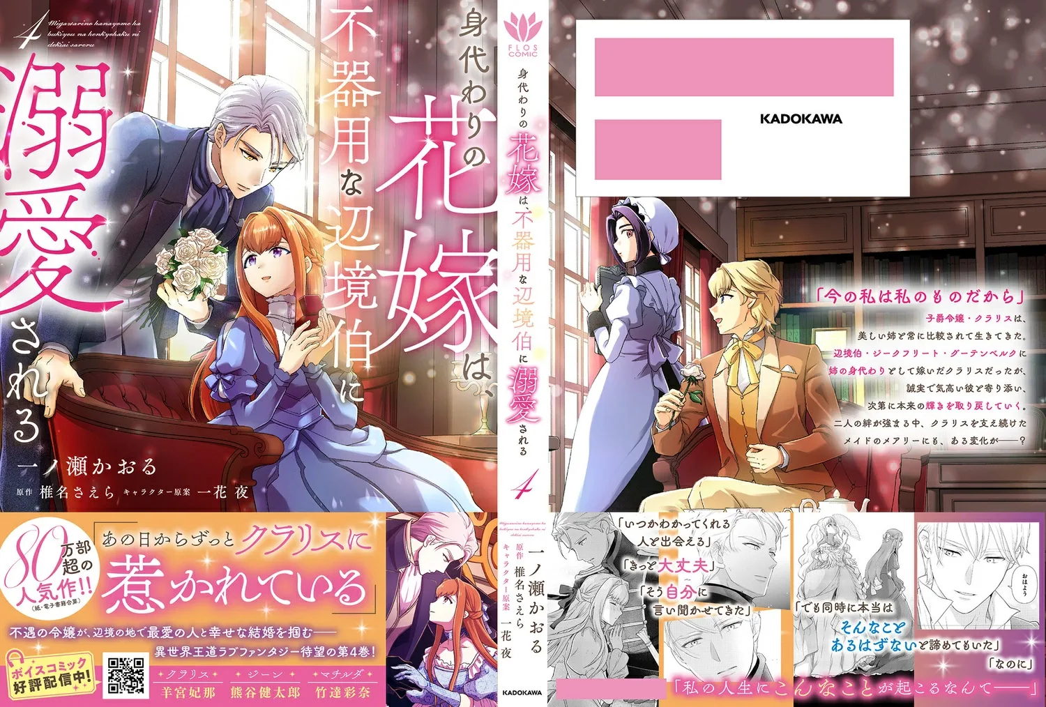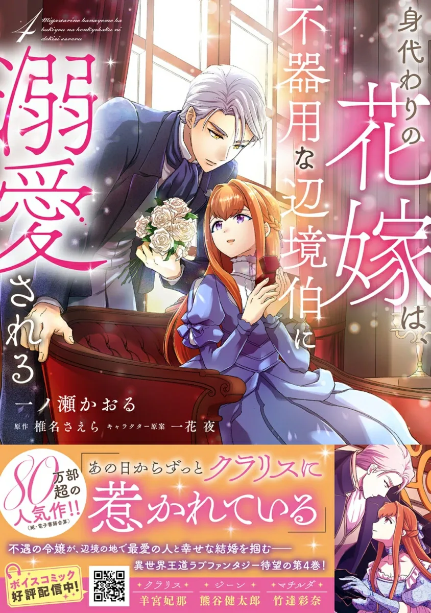 Виконтесса Клариса всегда сравнивалась со своей прекрасной старшей сестрой, известной как жемчужина Фаренгейта, и жила в условиях угнетения со стороны своей семьи. Внезапно Кларису выдают замуж за Зигфрида Гутенберга, известного как «маркграф-каннибал», вместо сестры, но она оказывается очарована его обаянием. Сердце Кларисы, застывшее от чувства вины за то, что она была «заменяющей невестой», постепенно тает от искренности Жана. Первая встреча Кларисы и Жана. «Действительно ли Клариса была заменой?» Ответ раскрывает сам Жан…! По мере того, как их связь крепнет, Мэри, служанка, которая всегда поддерживала Кларису, также хранит тайну…? Четвертый том этой классической любовной фэнтези, где несчастная молодая леди находит счастье в далекой стране с любимым человеком!