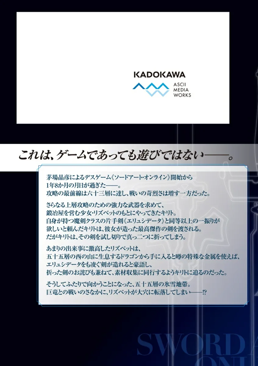 уговаривает Кирито пойти с ней за материалами. И вот они вдвоем направляются на пятьдесят пятый этаж, покрытый льдом и снегом. В разгар битвы с гигантским драконом Лиз проваливается в огромную яму —!?