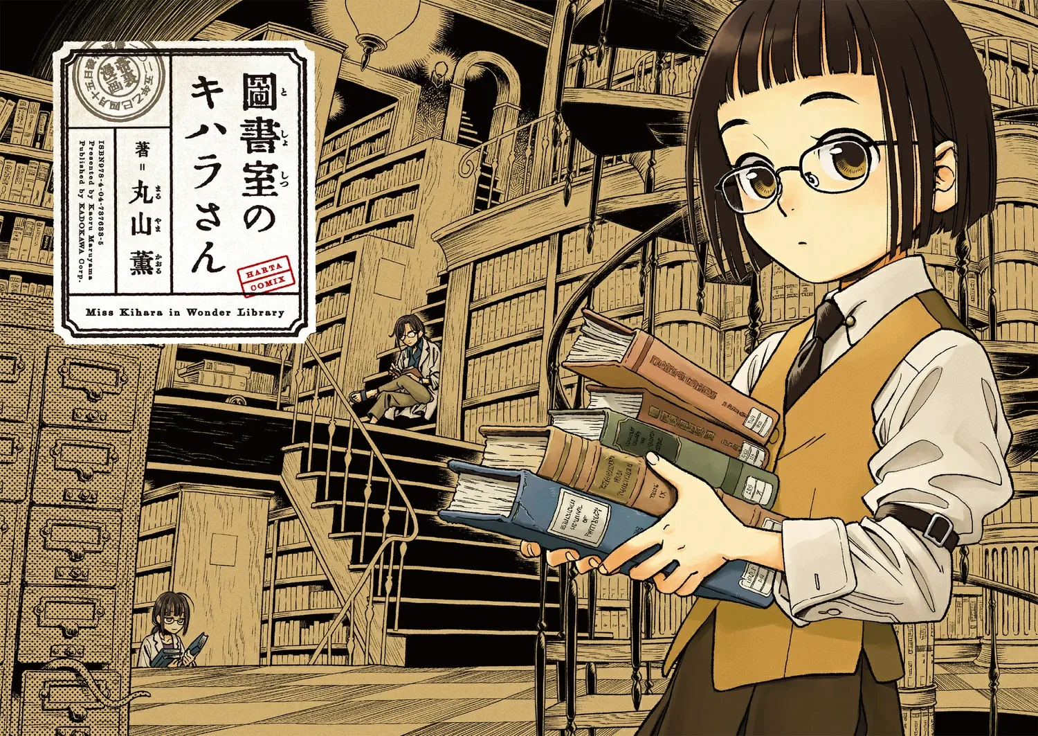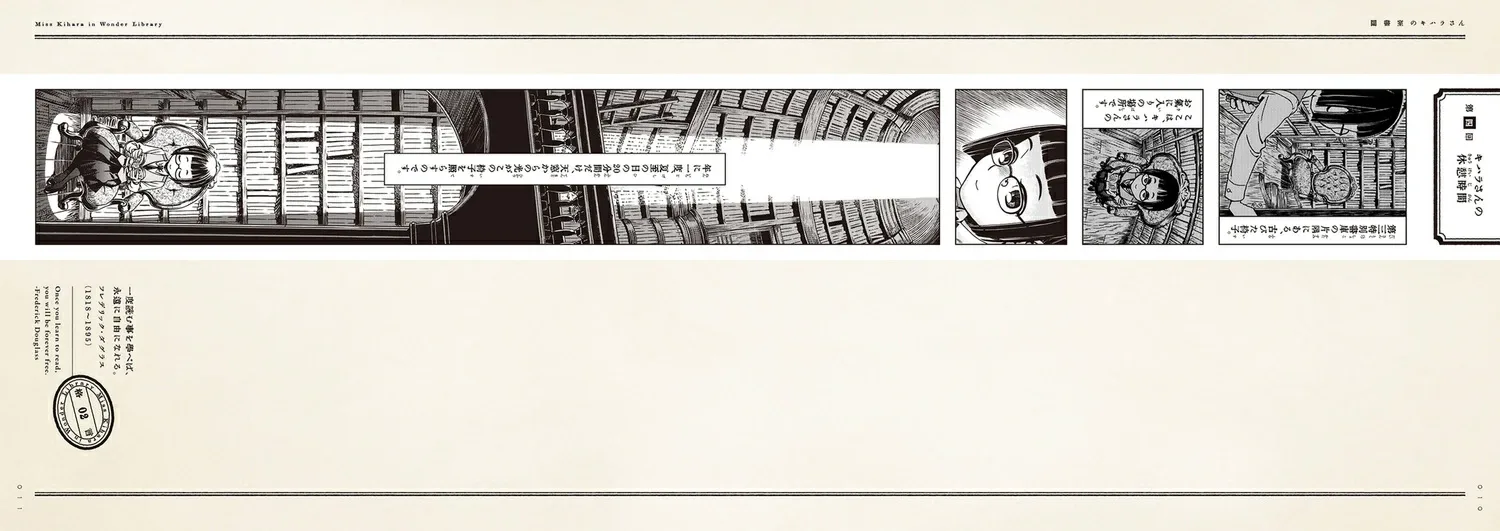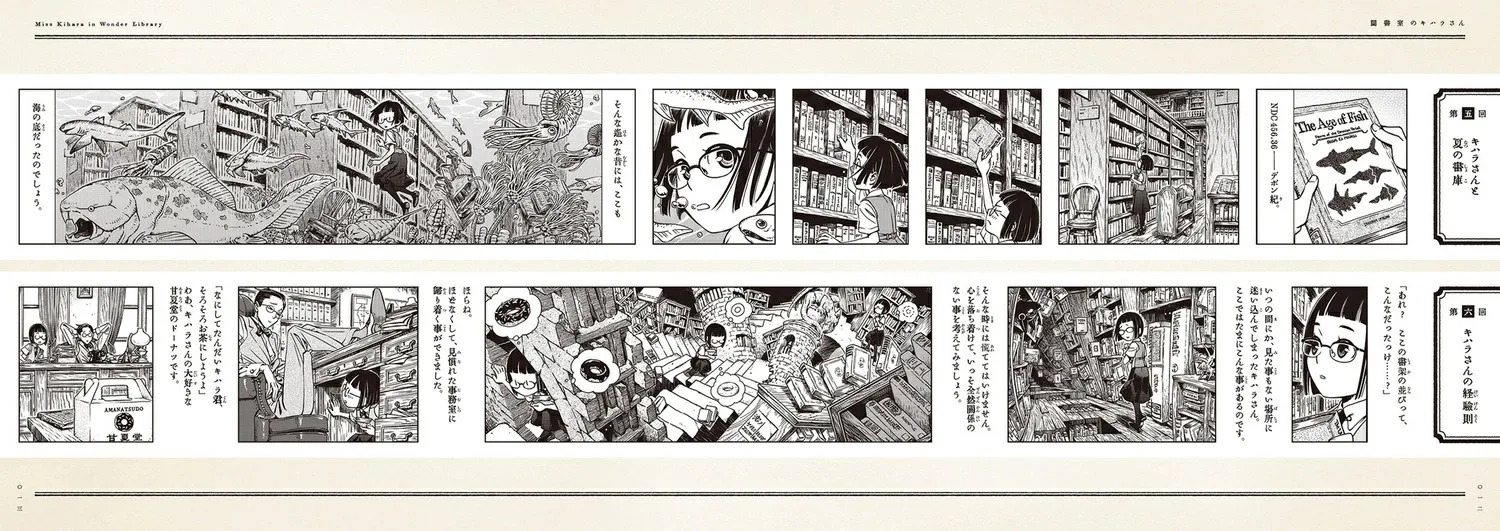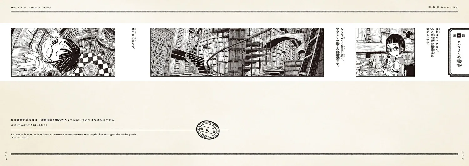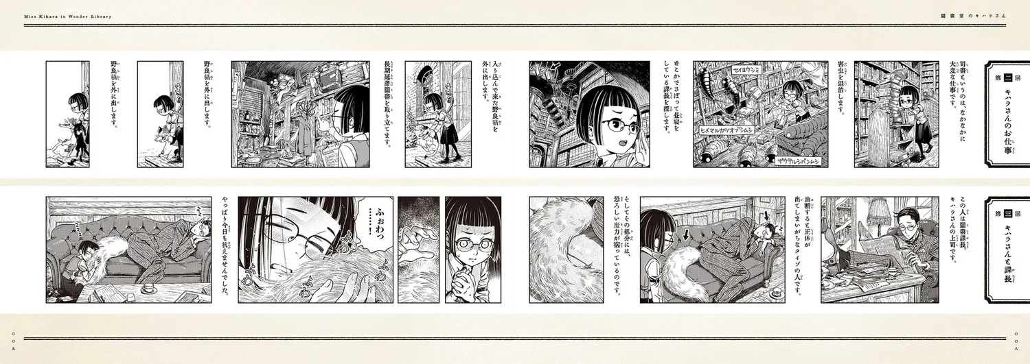 Действие происходит в библиотеке одного научно-исследовательского института. Эта книга, «Кихара-сан в библиотеке», повествует о забавной (и немного странной) повседневной жизни Кихары-сан, девушки с короткой стрижкой и в очках, которая работает там, вместе со своими начальниками и коллегами.
