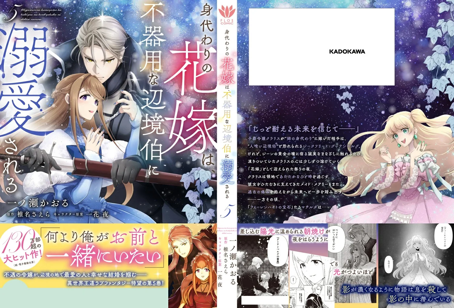 Виконтесса Клариса постоянно сравнивалась со своей прекрасной старшей сестрой Матильдой и подвергалась плохому обращению со стороны семьи. Мужчина, за которого она вышла замуж «вместо сестры», — Зигфрид Гутенберг, которого боялись как «маркграфа-людоеда». Но каждый раз, когда она касалась искреннего взгляда в его золотых глазах, замерзшее сердце Кларисы медленно таяло. Жан обнимал ее с непоколебимой добротой и продолжал изливать на нее свою глубокую привязанность, ведь она страдала от комплекса неполноценности, будучи «невестой-заменителем». В конце концов, Клариса поверила в свою собственную ценность и тихо расцвела. В ночь праздника в ее честь они делились своими чувствами и проводили вместе теплое время в поместье. Тем временем Мэри, служанка, которая поддерживала Кларису, также решила двигаться дальше, неся боль своего прошлого. В то же время Матильда, «Жемчужина Фаренгейта», — молодая девушка из неблагополучной семьи, обретающая счастье со своим возлюбленным в далекой стране — классическое фэнтези, действие которого разворачивается в другом мире. Пятый том полон предзнаменований грядущих потрясений!