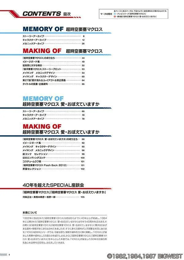 〇СОЗДАНИЕ «Крепости Супер Пространства Макросс»: Помнишь ли ты любовь? Истоки «Крепости Супер Измерения Макросс: Помнишь ли ты любовь?» / Сборник раскадровок / Создание дизайна персонажей / Создание дизайна механики / Выбор раскадровок / Раскадровка фантомной концовки / Черновые эскизы костюмов / «Крепость Супер Измерения Макросс: Флэшбэк 2012» / Выбор оригинальных рисунков