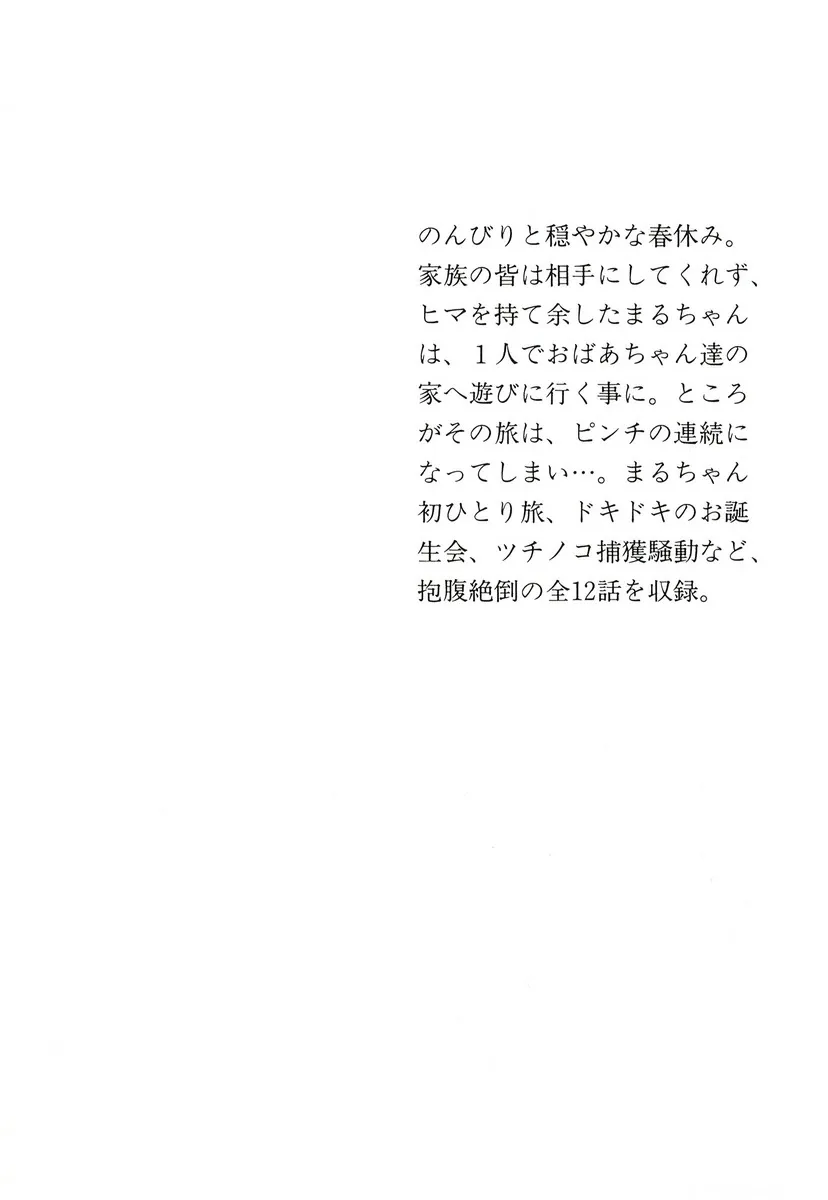 Спокойные и размеренные весенние каникулы. Поскольку семья ее игнорирует, Мару-тян, скучая и не зная, чем заняться, решает одна отправиться в гости к бабушке и дедушке. Однако ее поездка превращается в череду опасных ситуаций… Этот том содержит 12 уморительных историй, включая первое самостоятельное путешествие Мару-тян, захватывающую вечеринку по случаю дня рождения и безумную гонку за Цутиноко (мифическим японским существом).