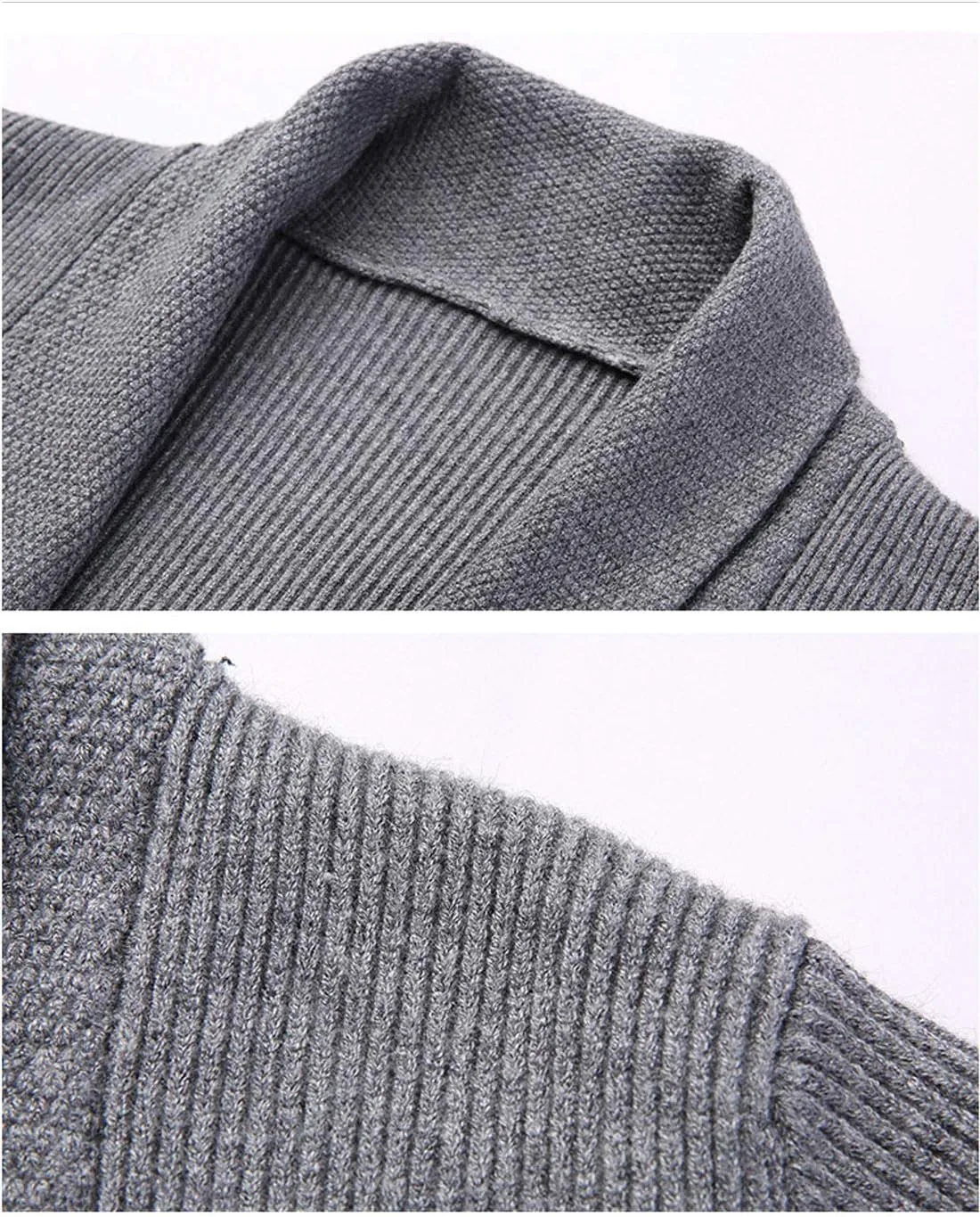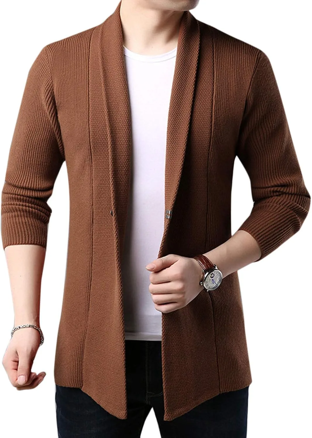 Мужской кардиган с воротником-шалью, открытой передней частью и застежкой на пуговицы, плотной вязки косами.