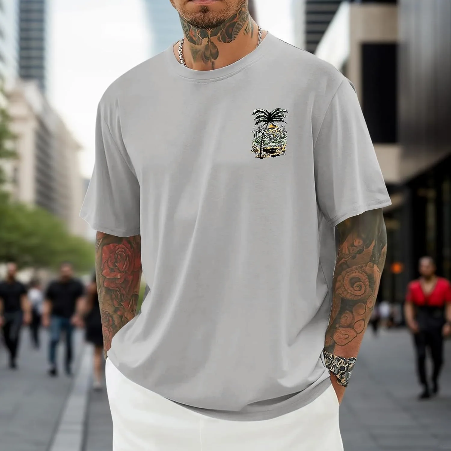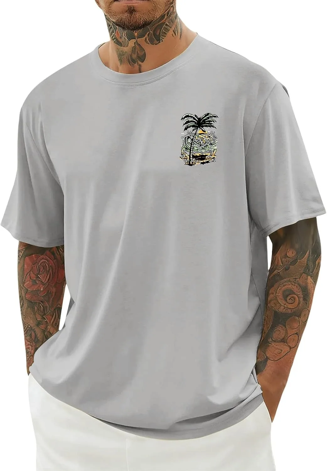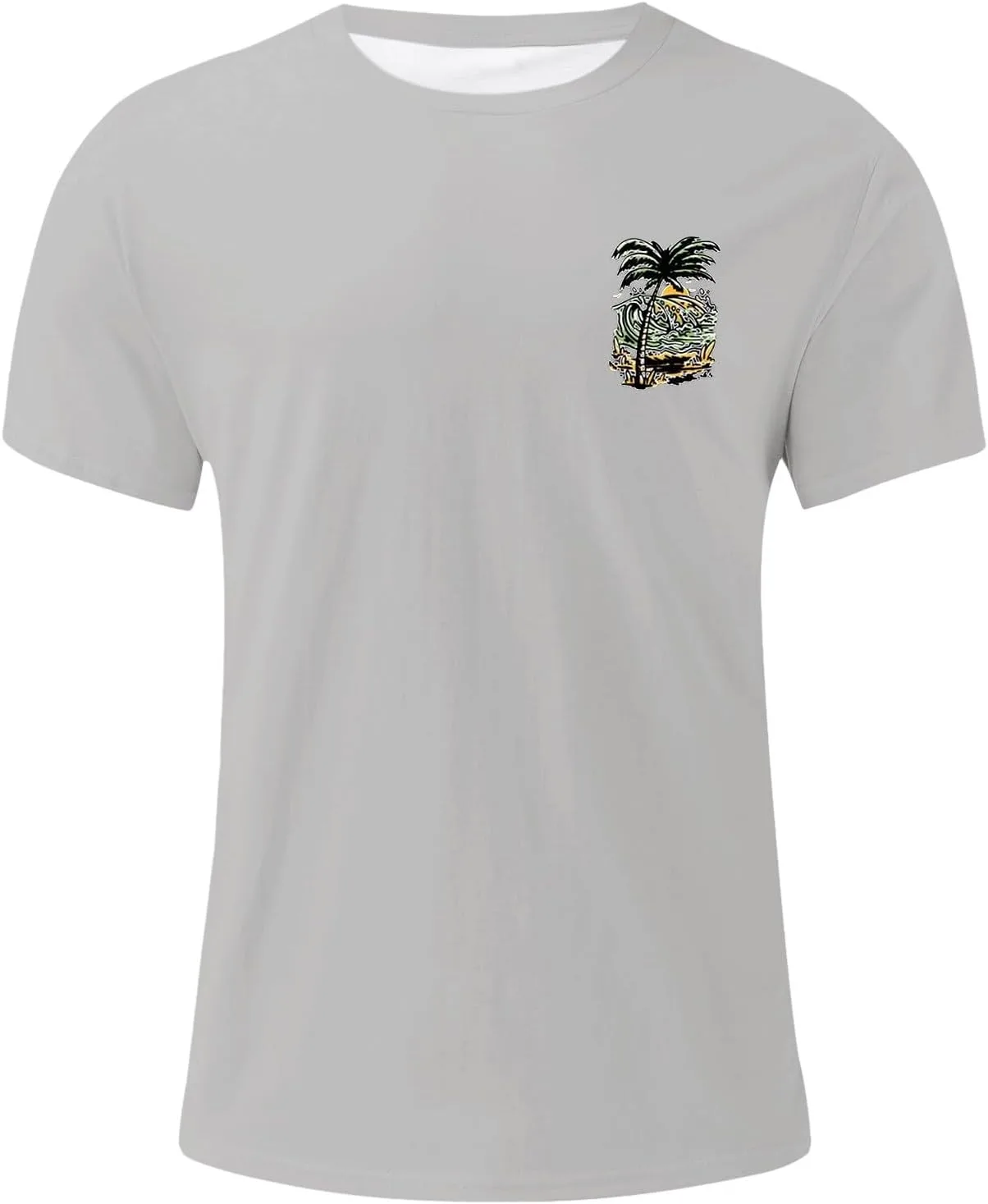 Особенности: Эта мужская футболка с коротким рукавом имеет классический круглый вырез и принт с изображением пальм на закате на груди — простой, но атмосферный дизайн. Базовый крой подходит для разных типов телосложения, что делает её подходящей как для повседневной носки, так и для занятий спортом.