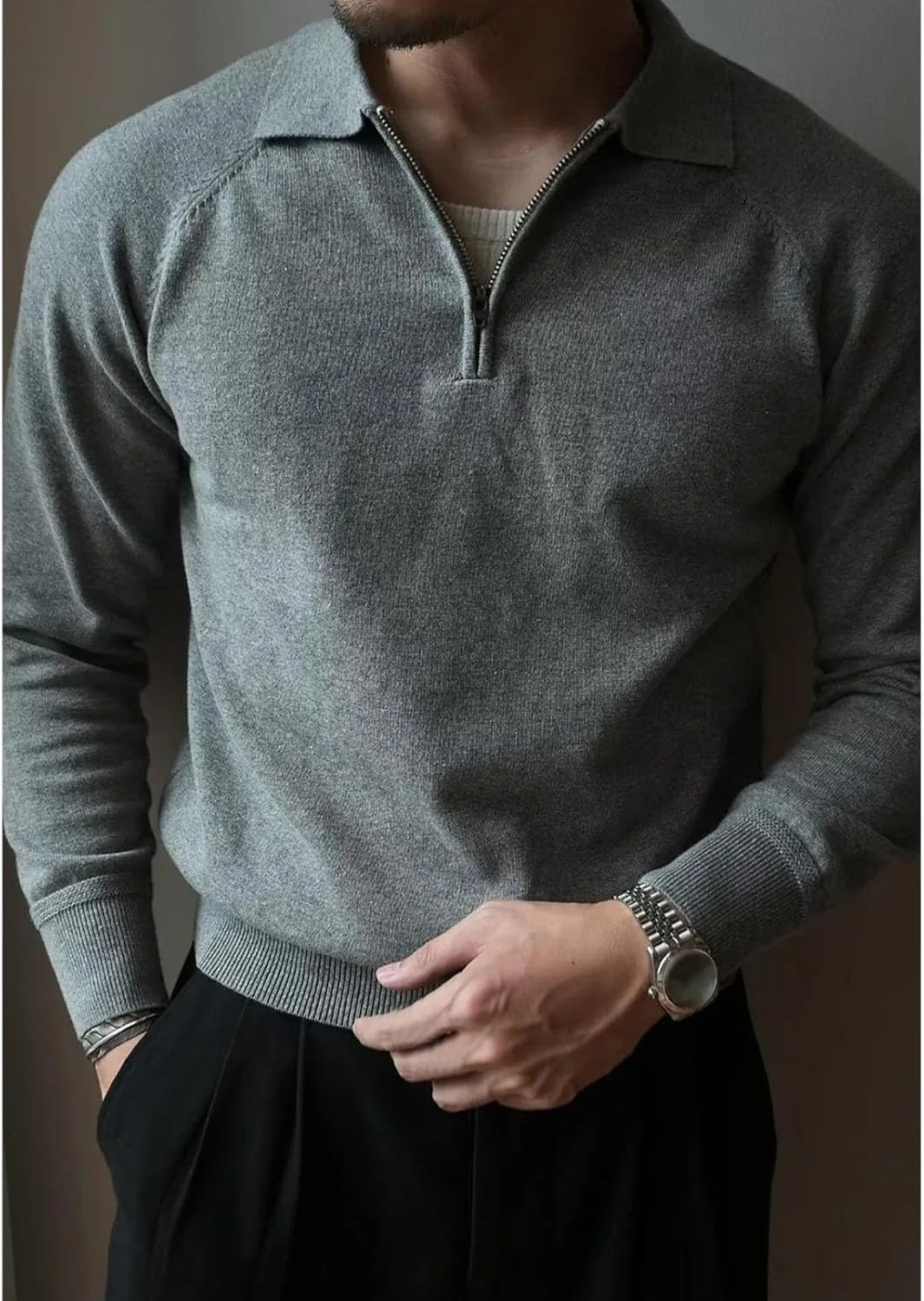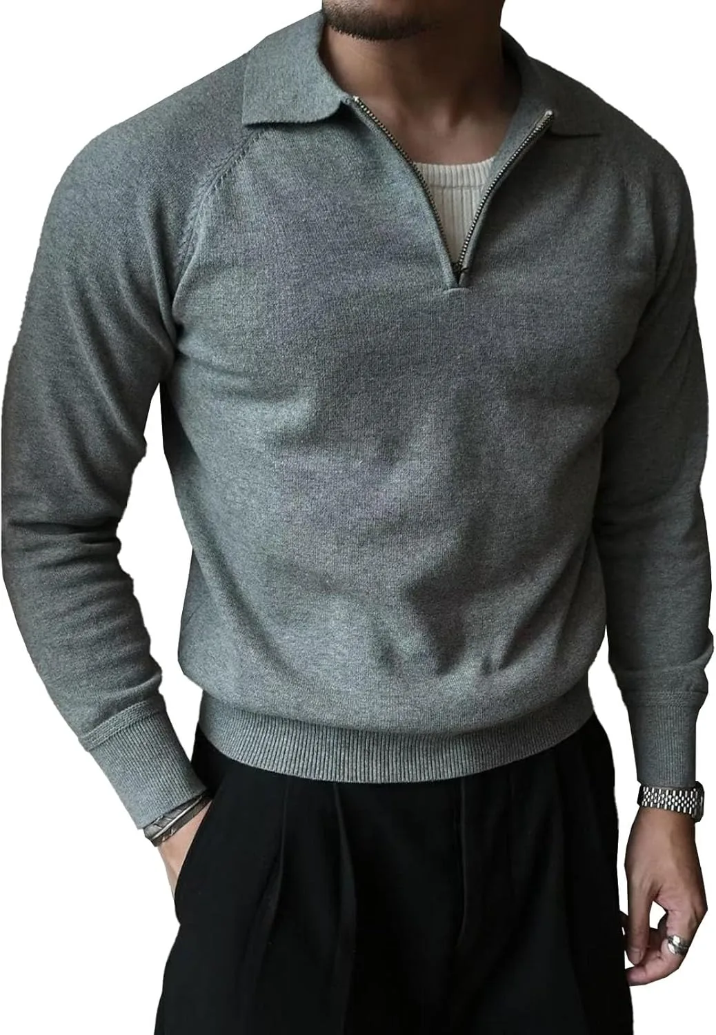 Описание: Воротник-стойка в рубчик, круглый вырез, лацканы, застежка-молния по всей длине, карманы, длинные рукава, стандартный крой, однотонный цвет, воротник-стойка, согревает шею, трикотажный свитер в рубчик, нижняя рубашка, придает элегантный вид.