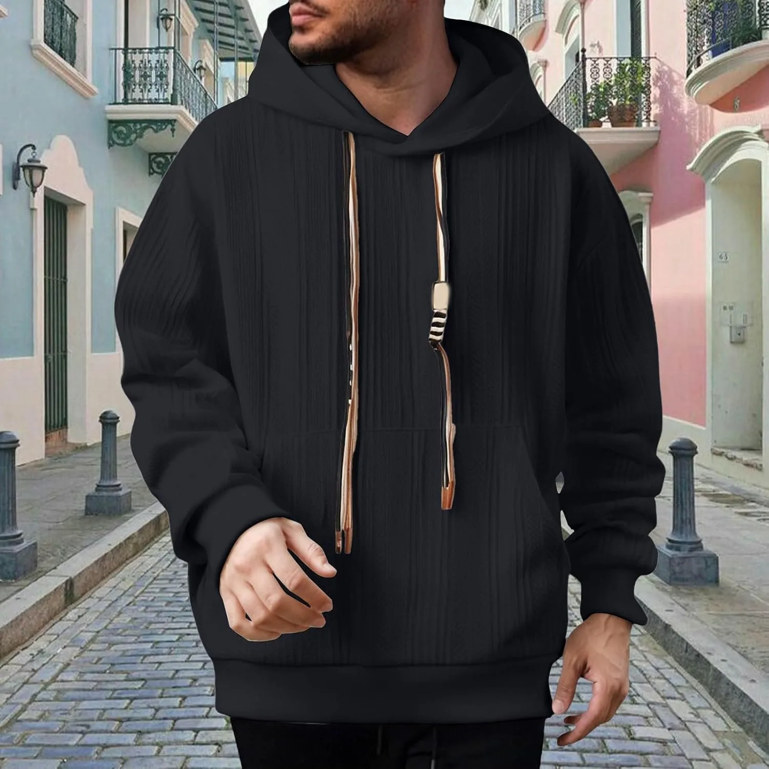 【Особенности】Мужская контрастная толстовка с капюшоном легко надевается и снимается, а также позволяет удобно регулировать плотность воротника в соответствии с потребностями ношения в различных погодных условиях.