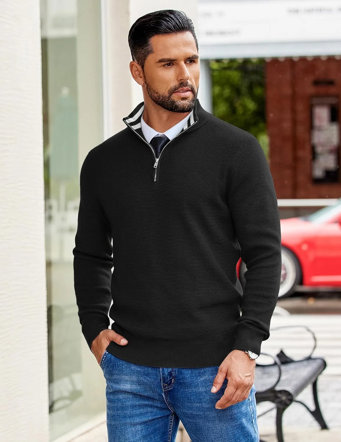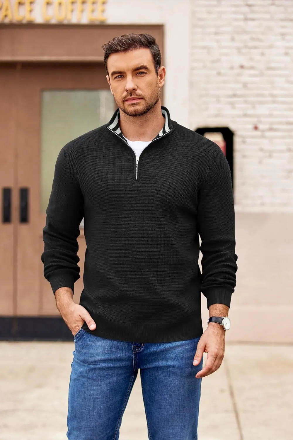 Контрастная вафельная вязка: Мужской поло-свитер с застежкой-молнией на четверть длины имеет контрастную внутреннюю отделку воротника, застежку-молнию на четверть длины, вафельную вязку, однотонный цвет, приталенный крой, воротник-стойку, лацканы, эластичные ребристые манжеты на рукавах и нижний край – никогда не выйдет из моды.