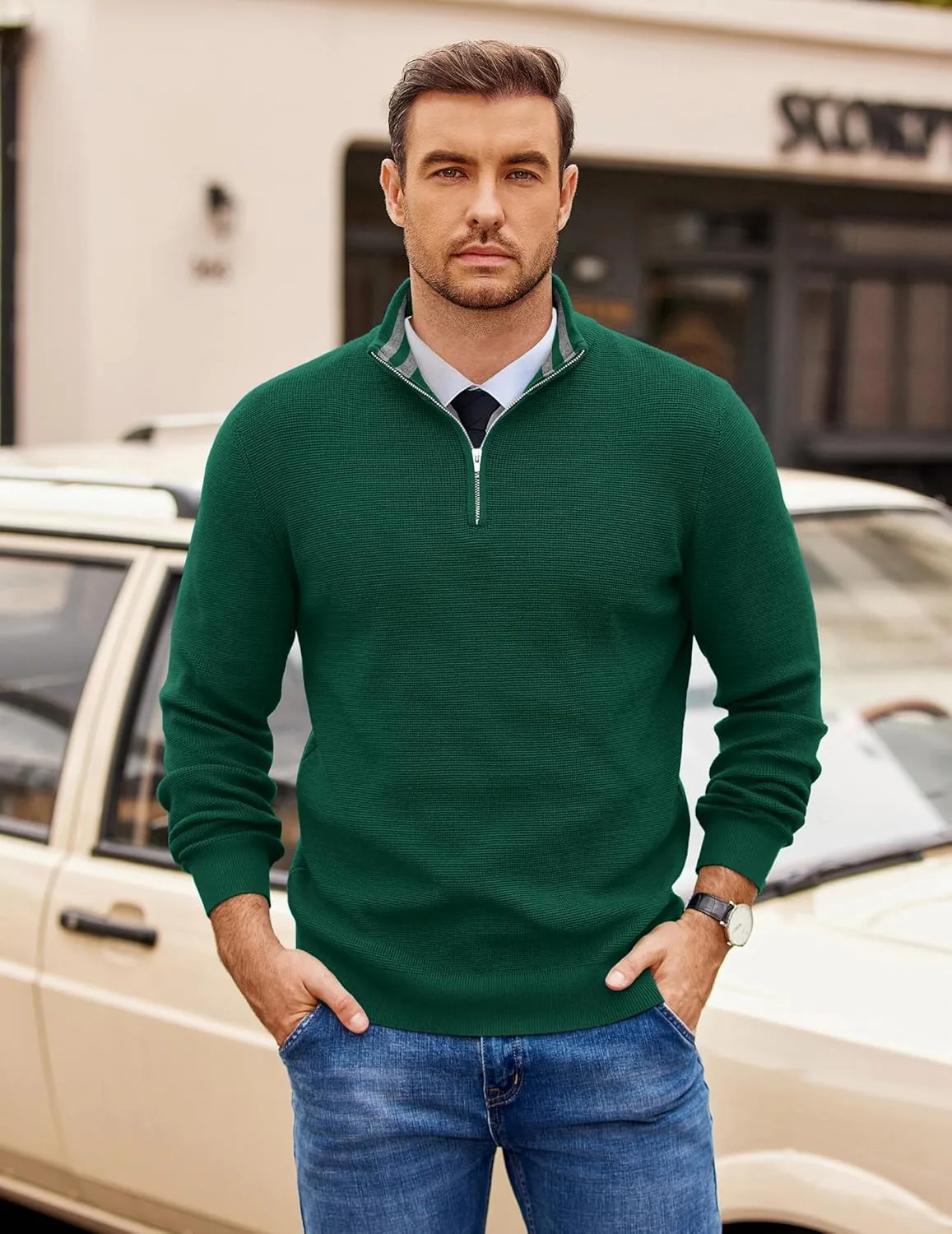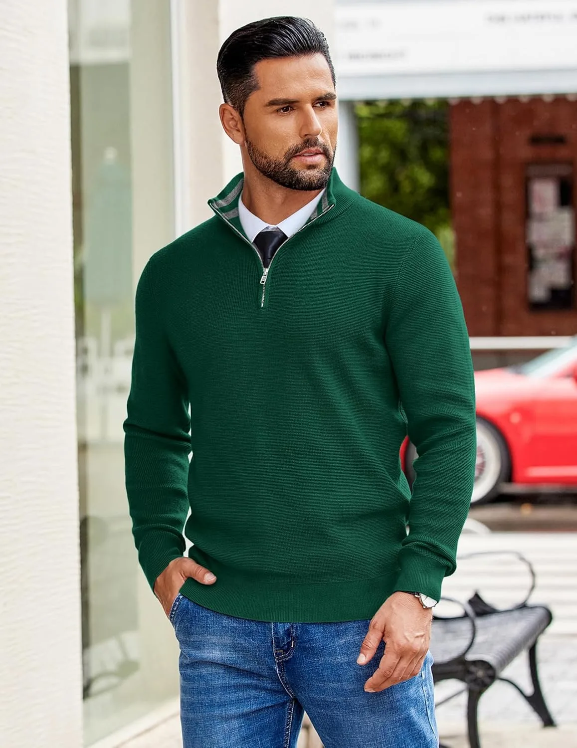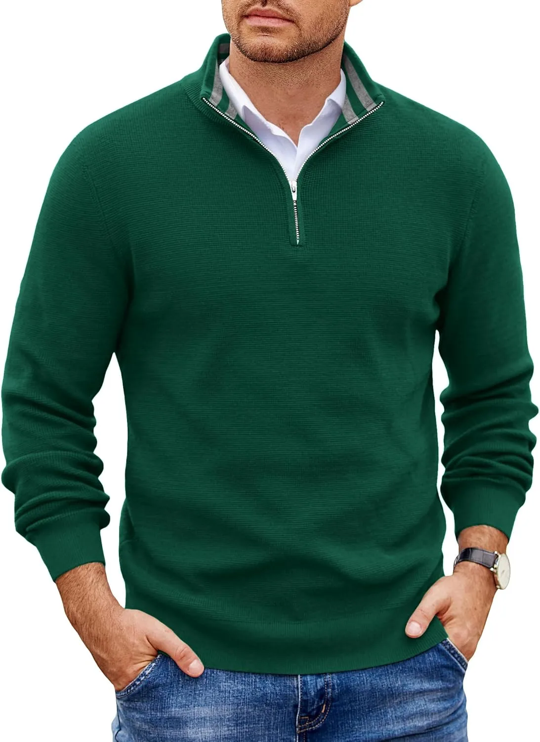 Контрастная вафельная вязка: Мужской поло-свитер с застежкой-молнией на четверть длины имеет контрастную внутреннюю отделку воротника, застежку-молнию на четверть длины, вафельную вязку, однотонный цвет, приталенный крой, воротник-стойку, лацканы, эластичные ребристые манжеты на рукавах и нижний край – никогда не выйдет из моды.