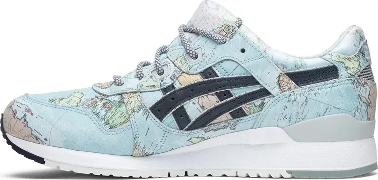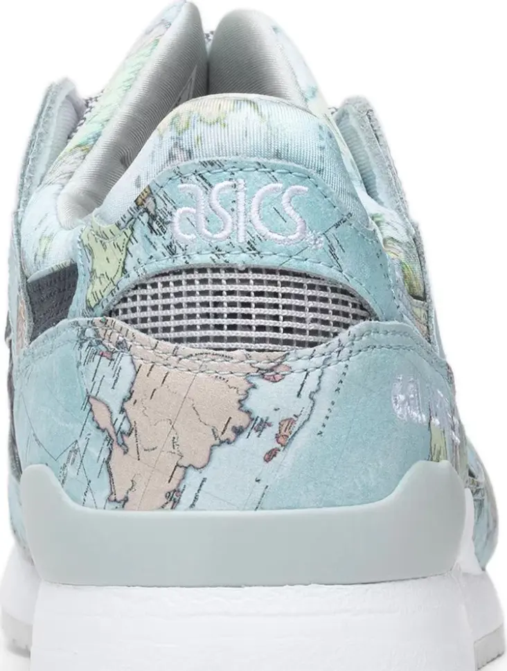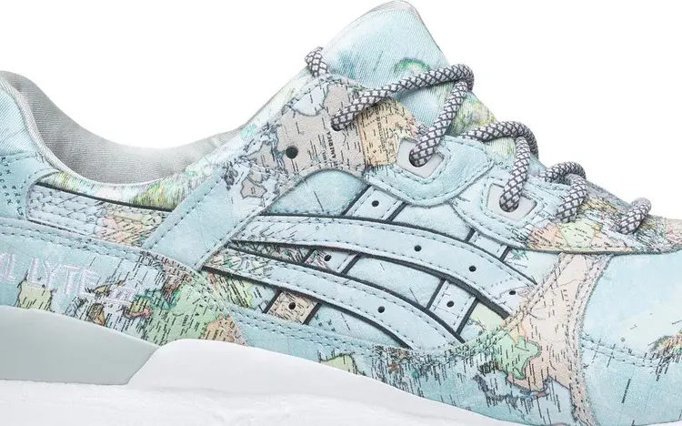 Кроссовки atmos x ASICS Gel Lyte 3 'World Map', представленные в ноябре 2018 года, характеризуют глобальное влияние спортивного бренда. Это издание, переосмысляющее классику старой школы с точки зрения картографии, поставляется с нарисованной от руки картой, напечатанной на кожаном верхе. Светоотражающие шнурки 3M и блестящие окна в передней части стопы придают фирменный вид. Ледяная, полупрозрачная на пятке подошва продолжает морскую тему.