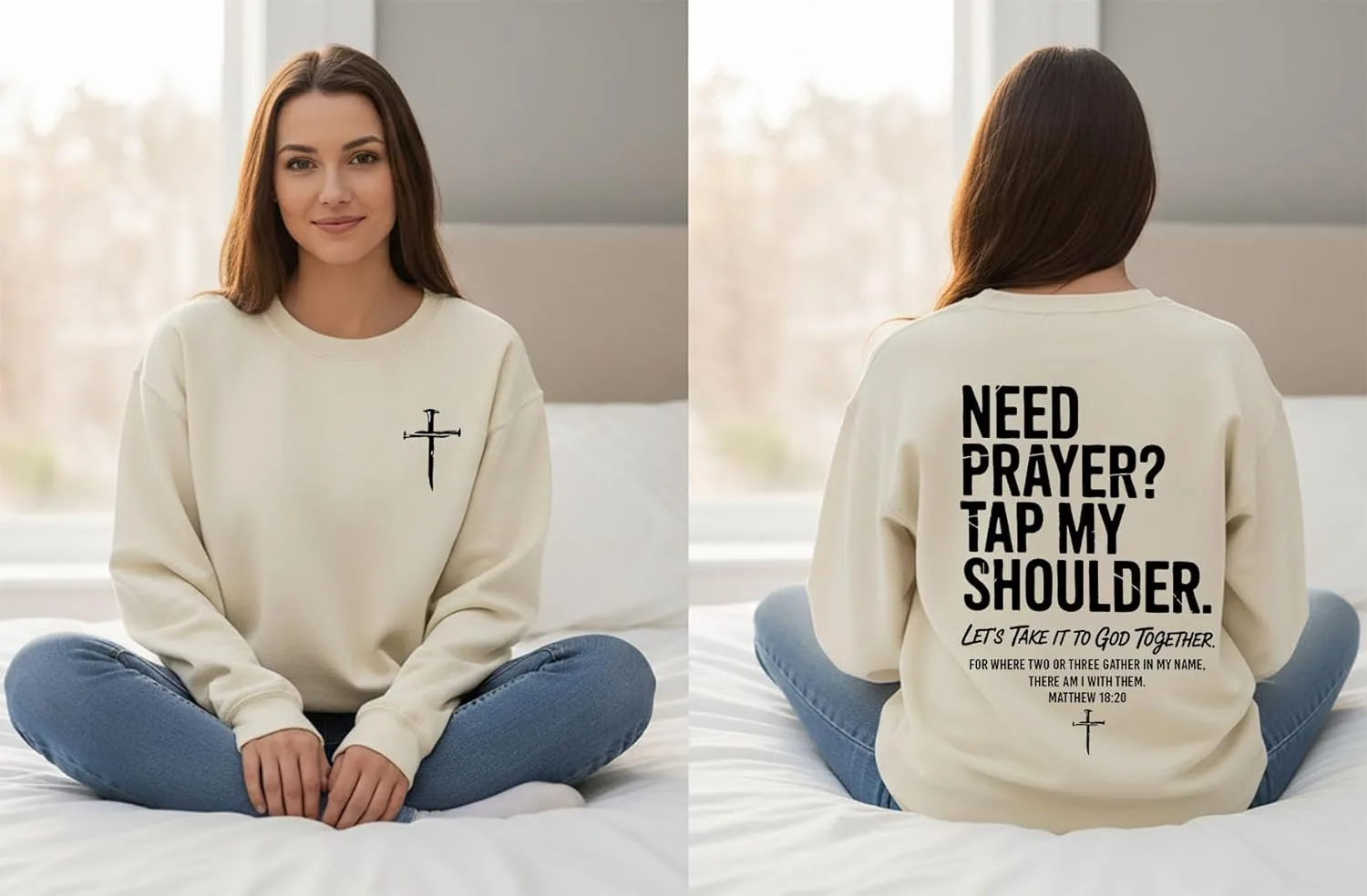 Удобная и теплая толстовка премиум-класса, изготовленная из мягкой смеси хлопка и полиэстера, обеспечивает тепло, не создавая лишнего объема. Уютная, но дышащая, идеально подходит для прохладных дней и демонстрирует смелое заявление о вере: «Нужна молитва? Похлопайте меня по плечу».