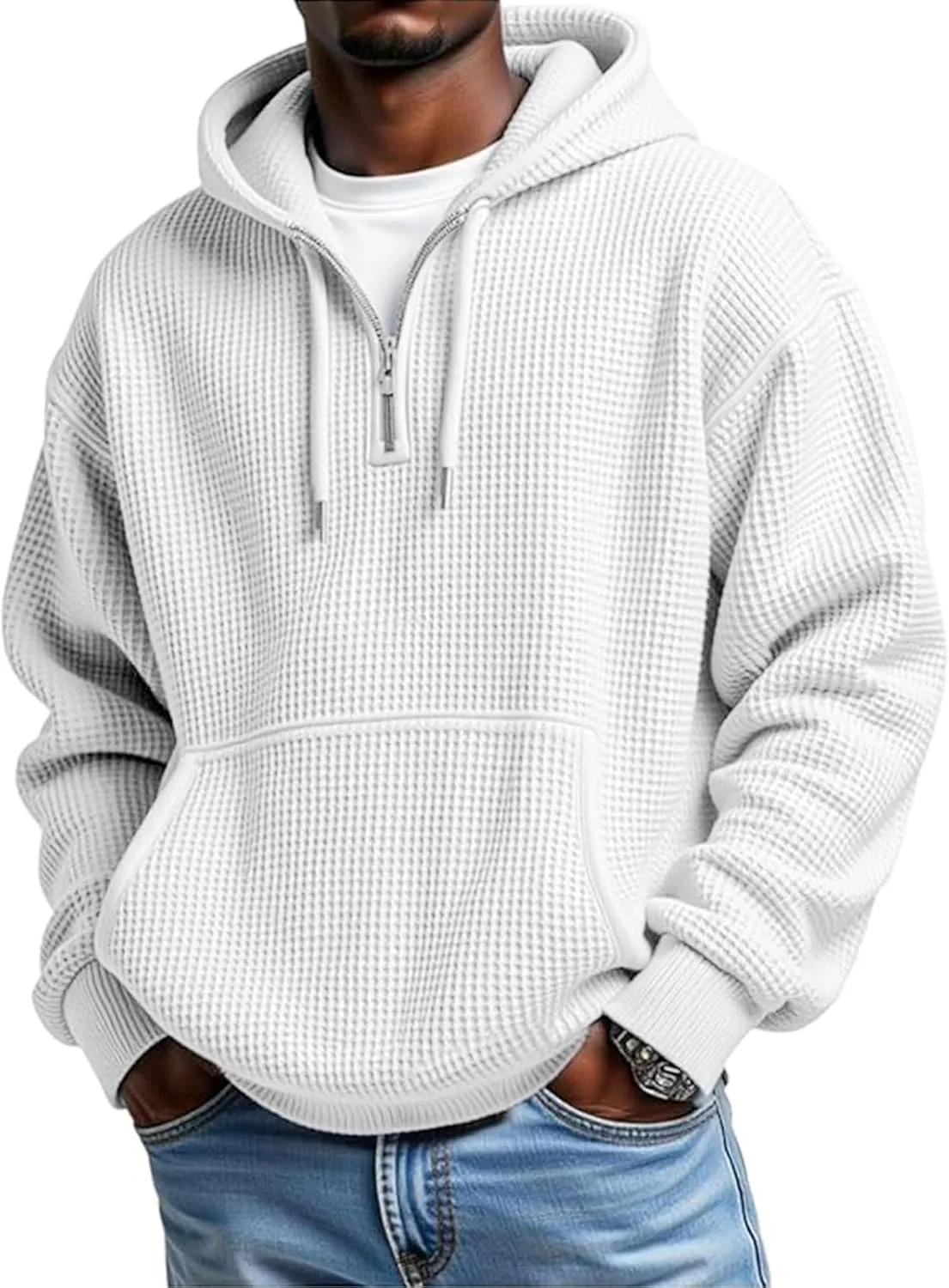 Особенности: Этот мужской пуловер с капюшоном и застежкой-молнией на четверть длины имеет современный свободный крой. Вафельная текстура, ребристые манжеты и нижний край, длинные рукава, пуловер с капюшоном, регулируемая эластичная резинка, передний карман.