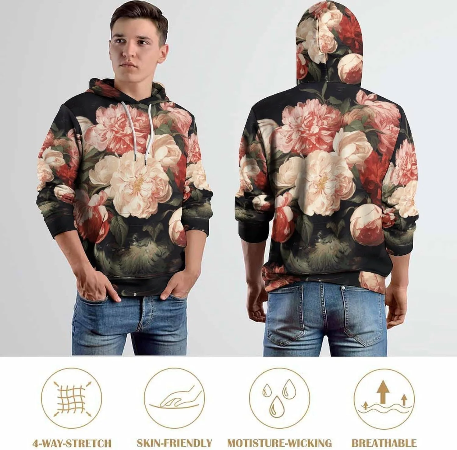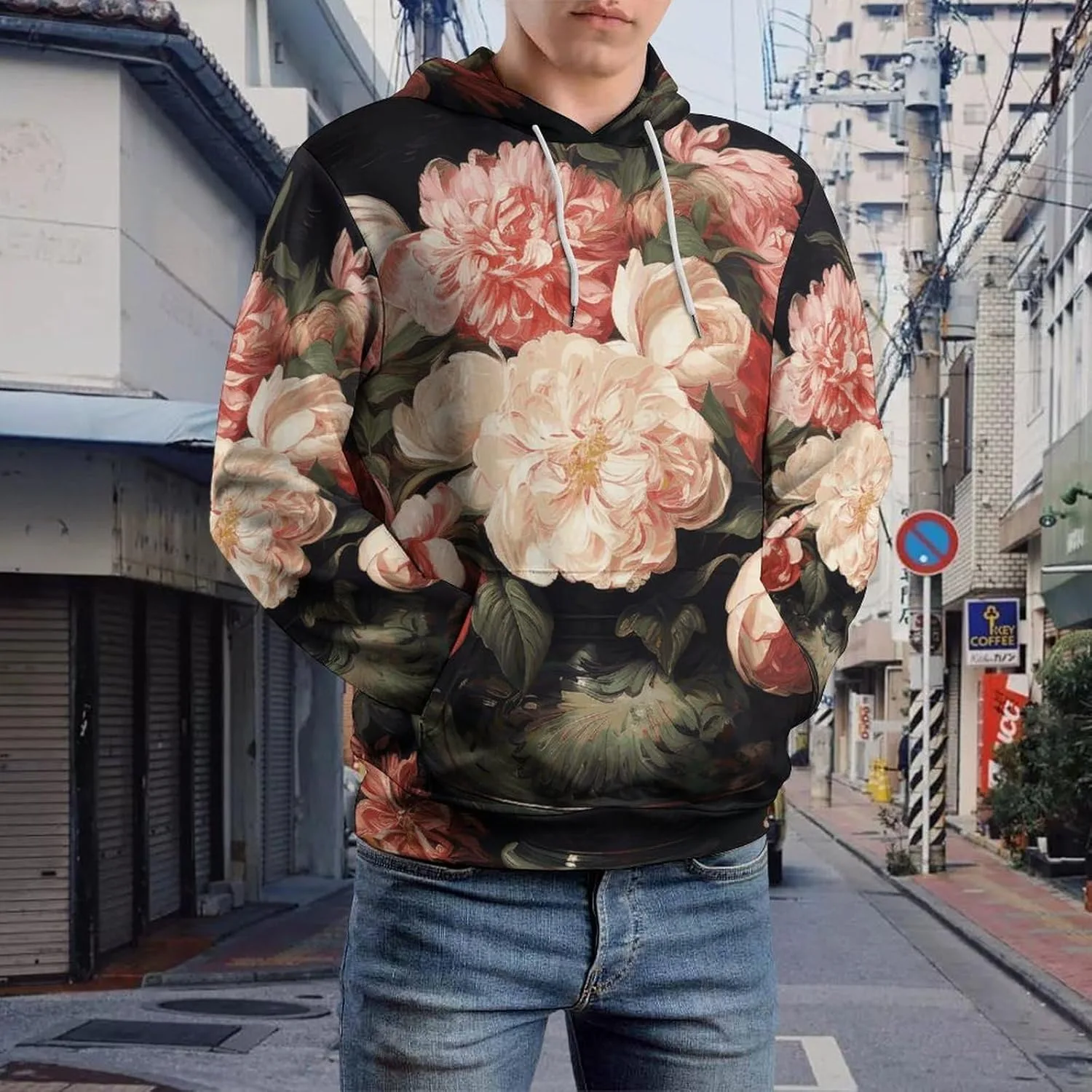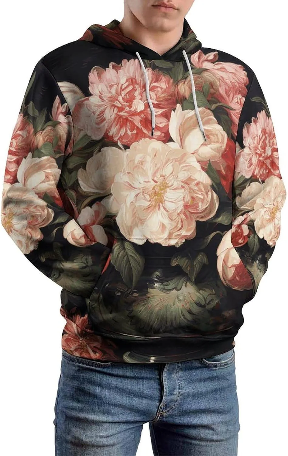 Дизайн толстовки с капюшоном - "Чаша с пионами и розами". Классический стиль толстовки с белым шнурком для идеальной посадки. Идеальный подарок для мужчин.