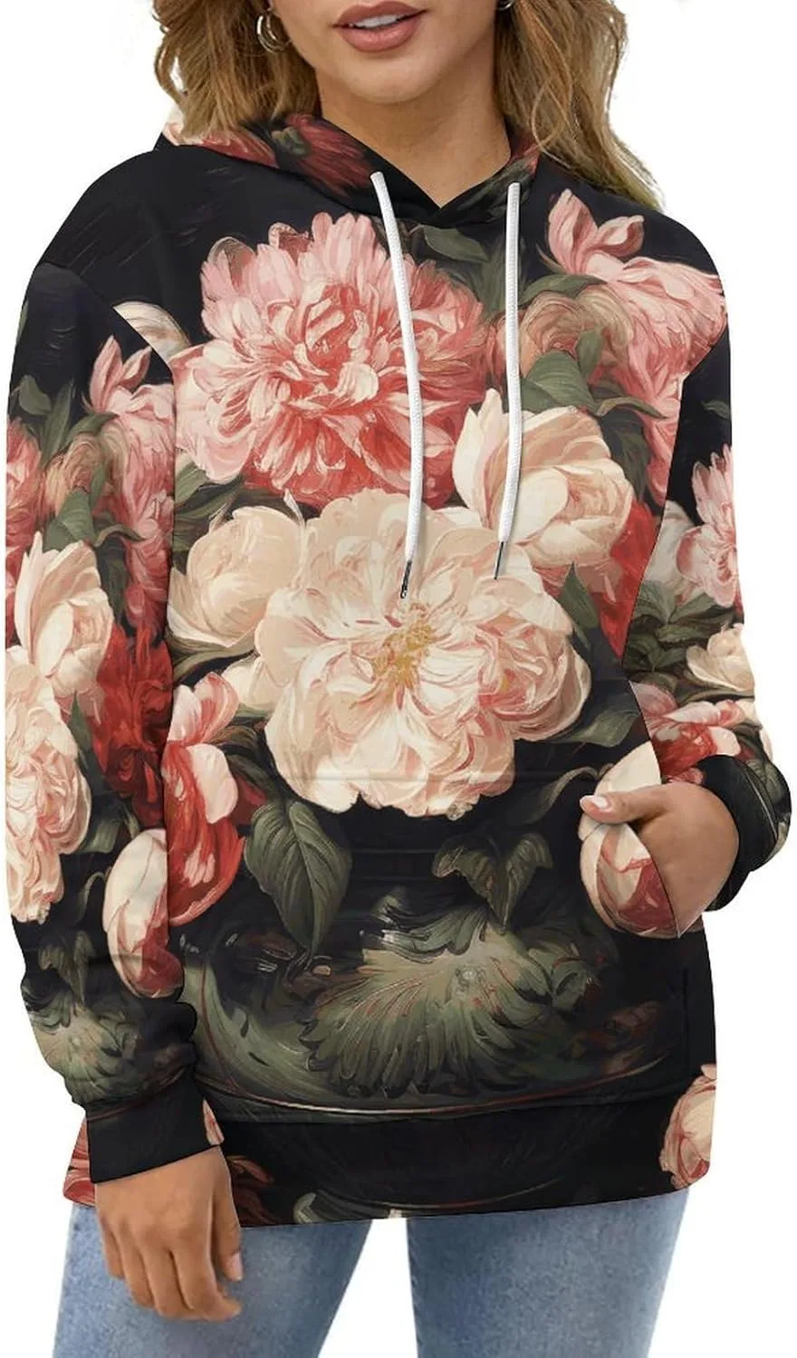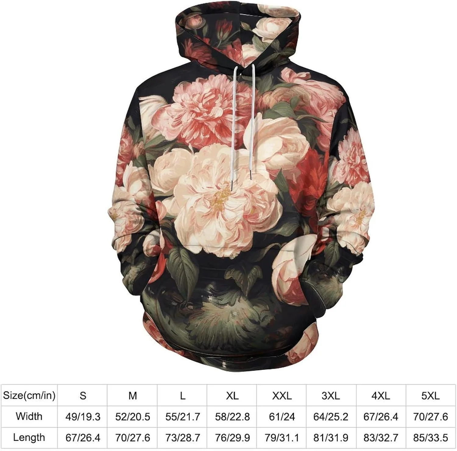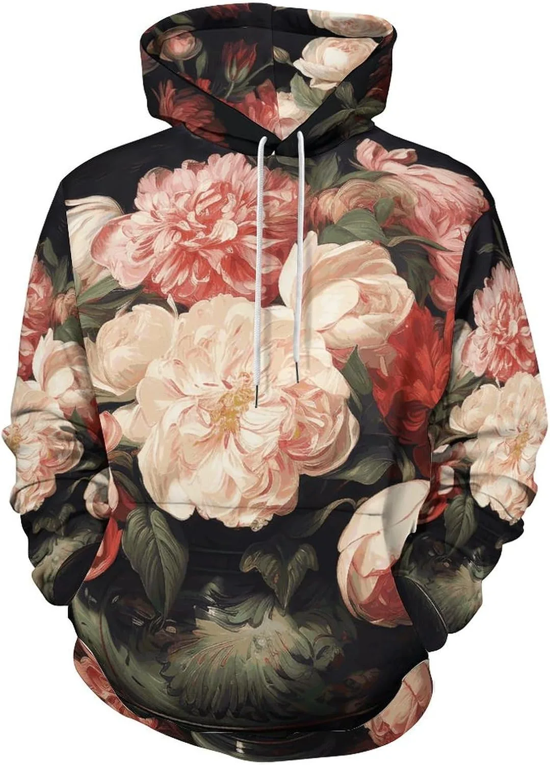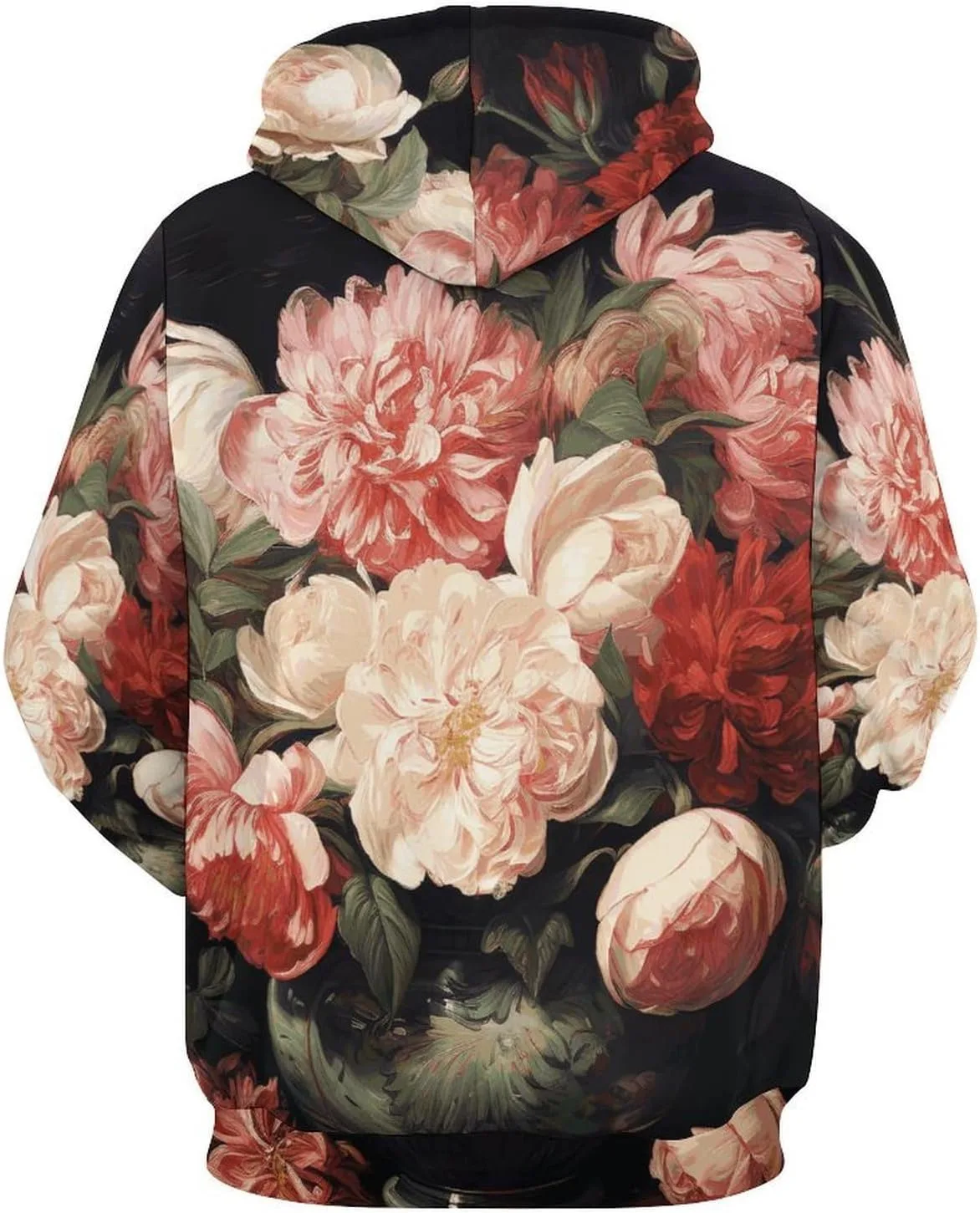 Модный и легко сочетающийся с другой одеждой: свободный крой большого размера. Удобный капюшон с раздельными карманами-кенгуру и регулируемым шнурком. Пуловер «Чаша с пионами и розами» подходит для людей с любой фигурой.