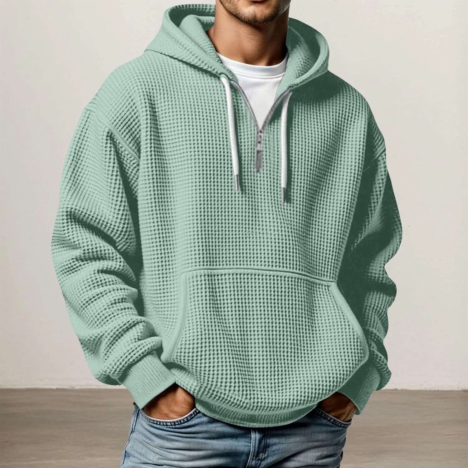 Уникальный дизайн: повседневная толстовка с капюшоном и вафельным рисунком для визуально привлекательной текстуры, однотонная, с длинными рукавами и складками, регулируемым шнурком и передним карманом-кенгуру. Простая и стильная для повседневной носки.