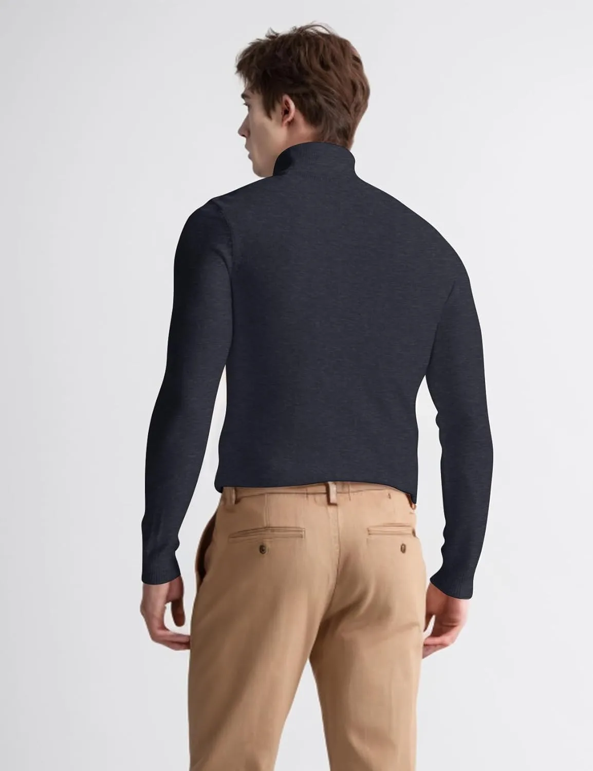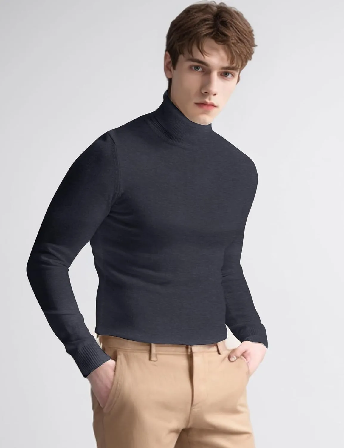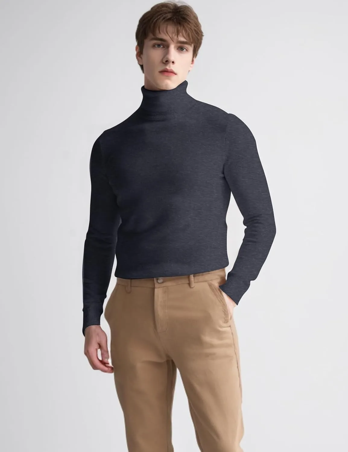 ДИЗАЙН: Мужской пуловер с высоким воротником, длинными рукавами, ребристыми манжетами, однотонный, очень эластичный, мягкий, легкий, теплый базовый пуловер для весны, осени и холодной зимы.