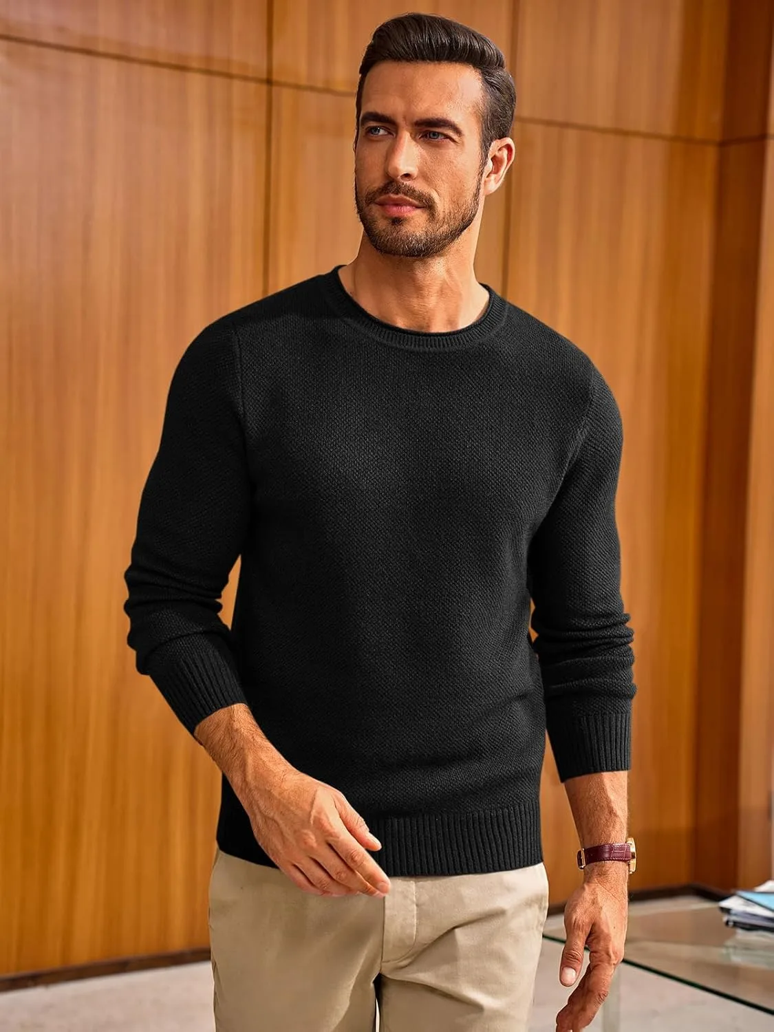Стильный дизайн: Мужской свитер с круглым вырезом имеет классический дизайн с длинными рукавами и отложным воротником, идеально сочетая в себе повседневный и элегантный стиль. Ребристые манжеты и нижний край обеспечивают комфорт, согревая в зимнее время и придавая образу стильный вид.