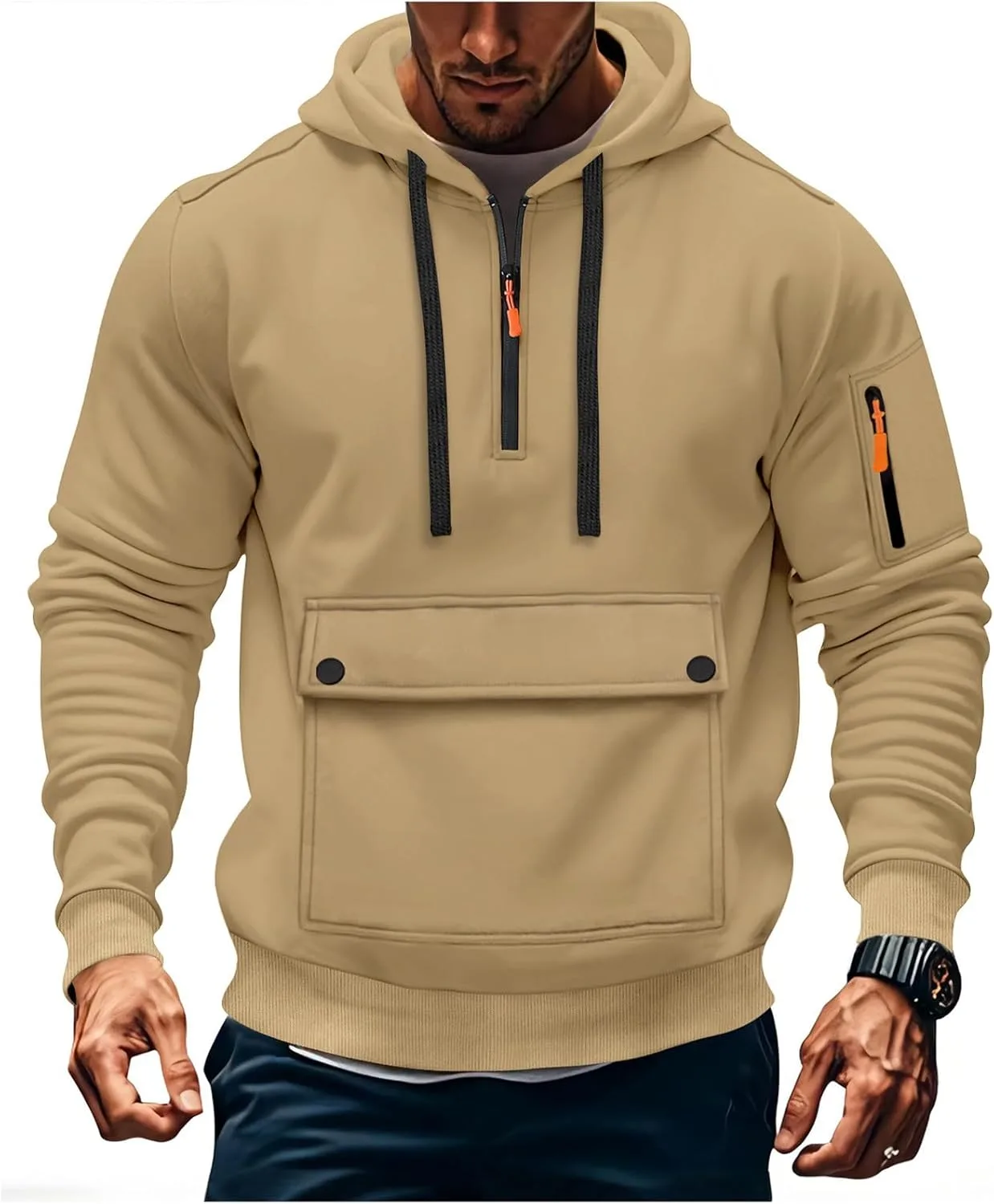 Сочетание: Плотные толстовки с капюшоном для мужчин отлично смотрятся поверх рубашек с воротником, создавая многослойные образы. Хорошо сочетаются с рабочими брюками для активного отдыха на природе.