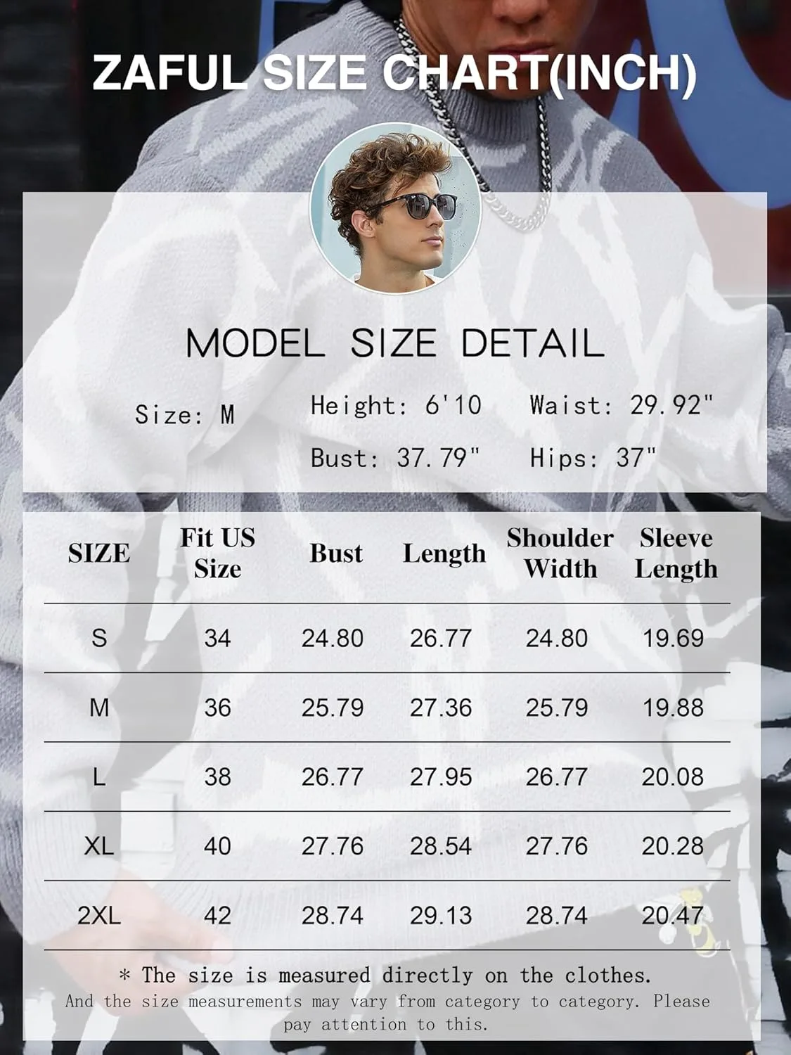 Цвет: 3-серый Узор: Графический Тип посадки: стандартный Тип свитера: Свитер-пуловер Название стиля: Мягкий Времена года: осень, зима Торговая марка: ZAFUL Возрастная категория: Взрослые ASIN: B0DG8HD1SY Тип посадки: стандартный Тип рукава: Длинный рукав Тип выреза: Круглый вырез Тип застежки: надевается через голову Инструкция по уходу за изделием: Только ручная стирка. Тип ткани: 100% полиэстер Описание длины изделия: Стандартная длина