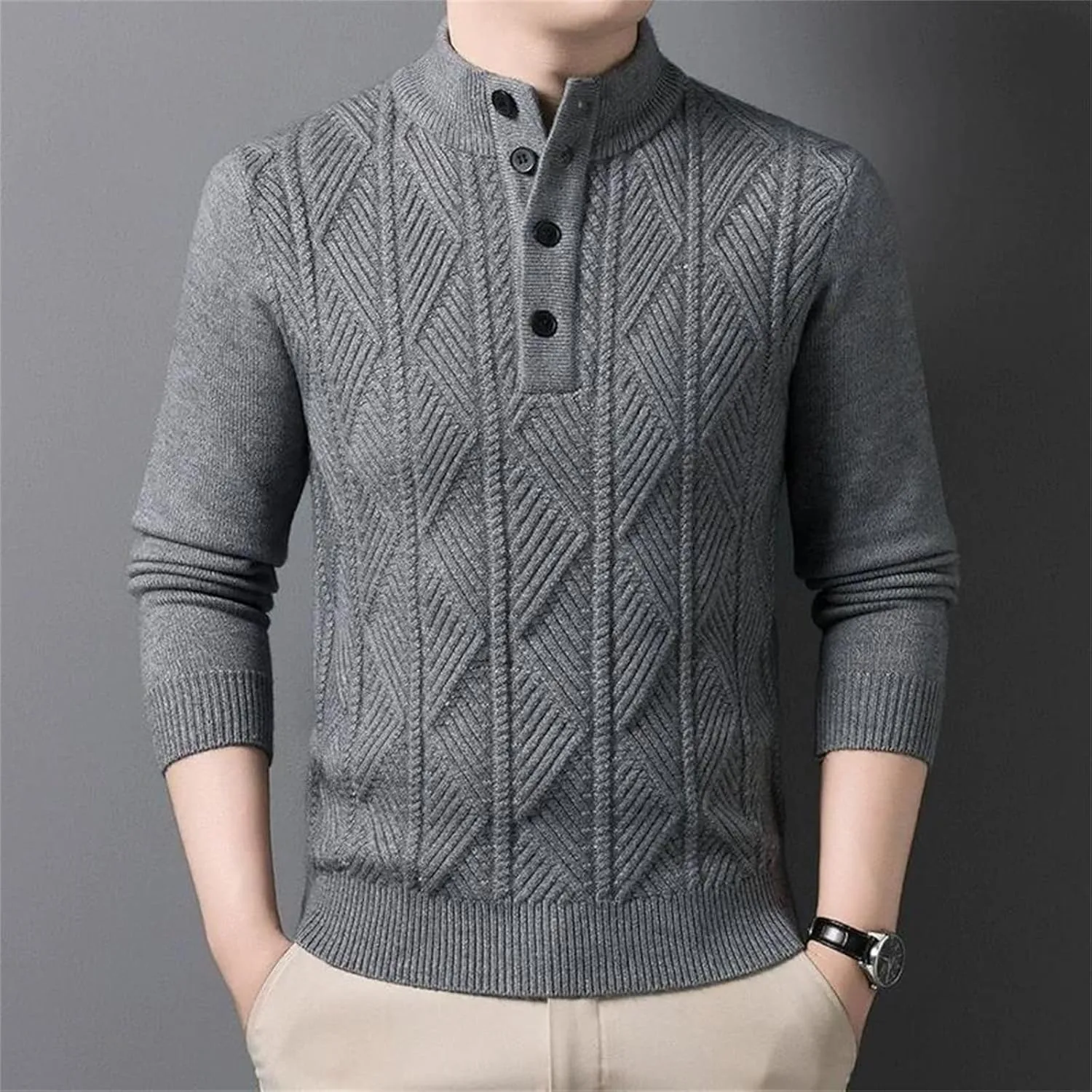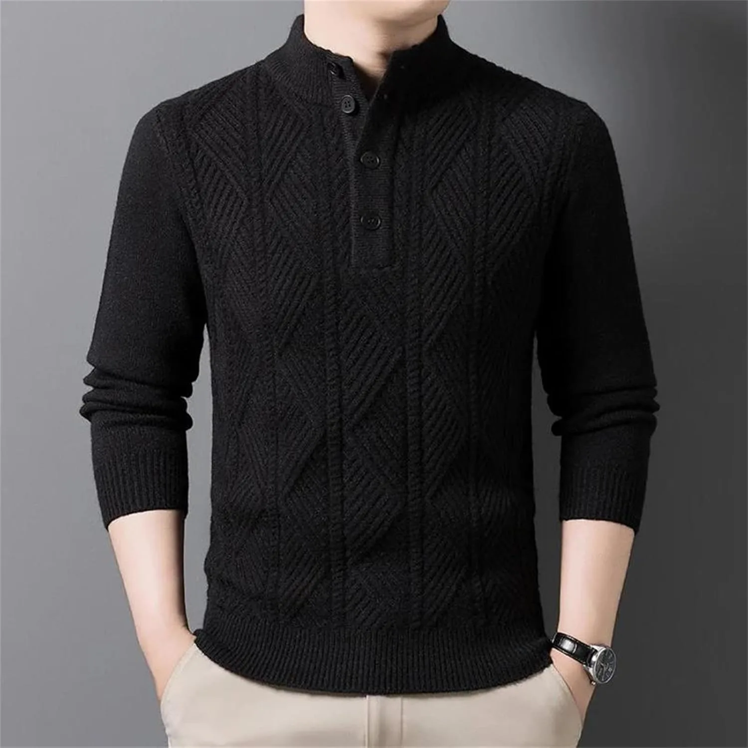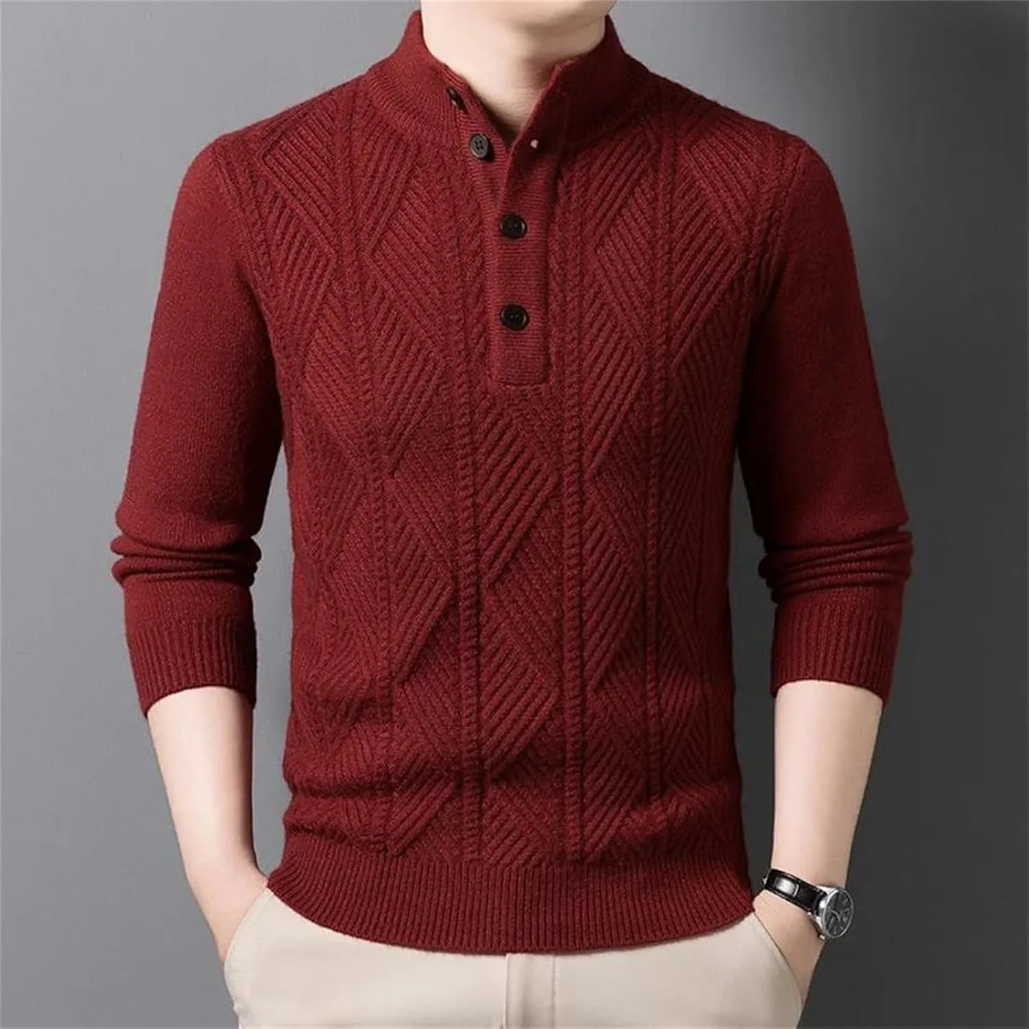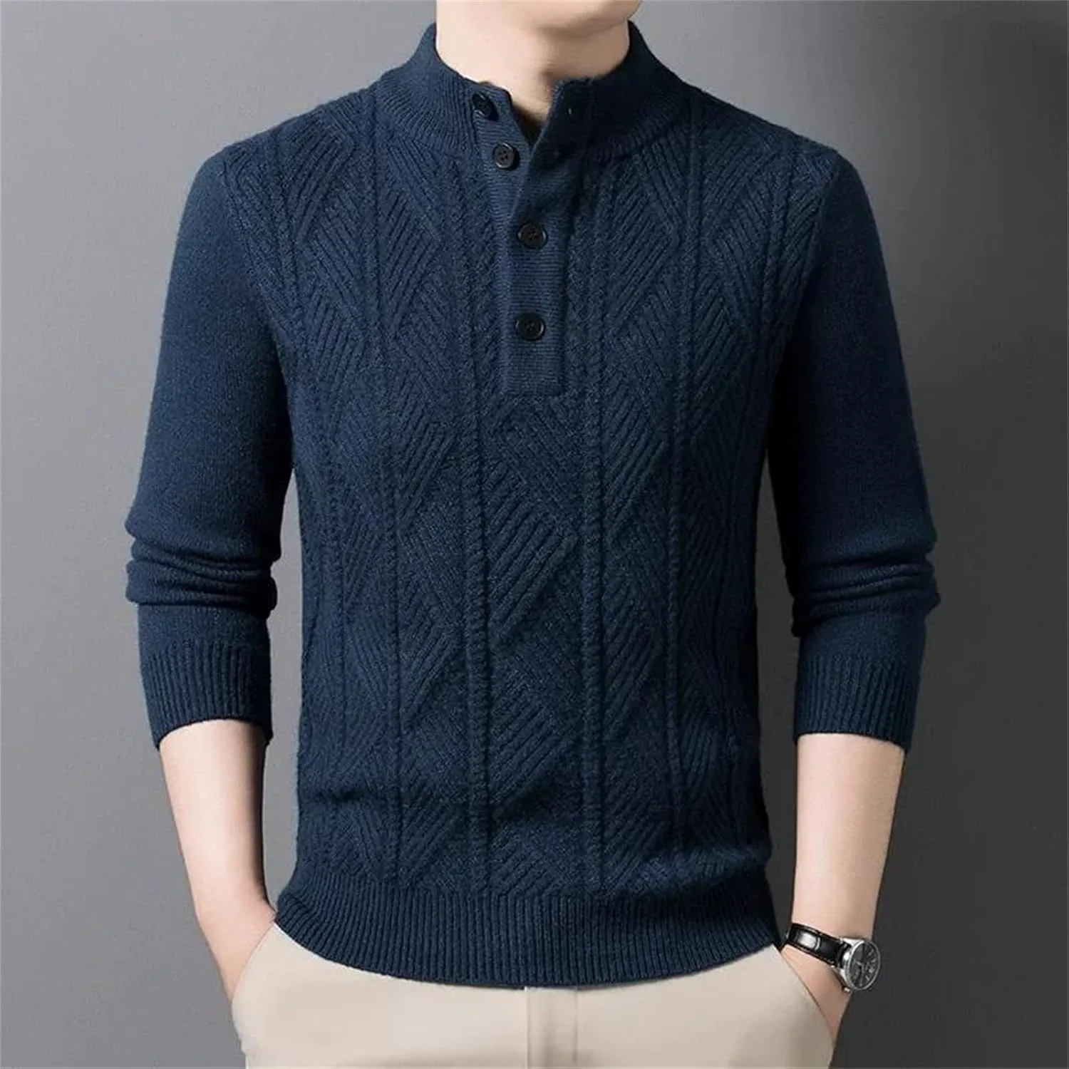 Этот мужской вязаный свитер из 100% шерсти создан для деловых встреч осенью и зимой. Изготовленный из высококачественной шерстяной пряжи, он мягкий на ощупь и обеспечивает тепло и комфорт. Трехмерная текстура вязки в сочетании с классическим V-образным вырезом подчеркивает элегантность и уверенность джентльмена. В сочетании с рубашкой для деловой встречи или в качестве самостоятельной вещи для повседневной прогулки, он легко создает изысканный и уравновешенный образ. Технология высокоплотной вязки гарантирует устойчивость свитера к деформации и образованию катышков, обеспечивая долговечность. Простая цветовая палитра и изысканные детали делают его универсальным элементом осенне-зимнего гардероба.