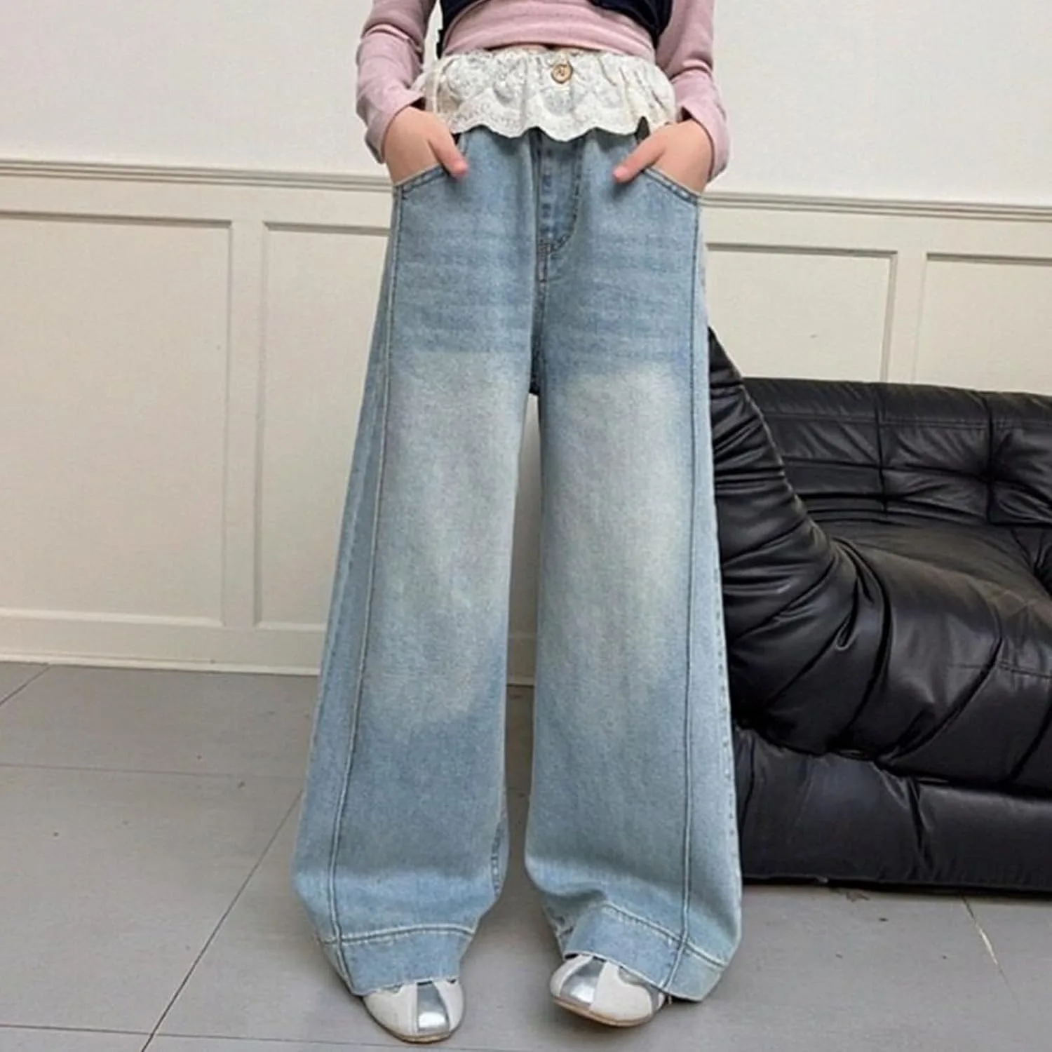 Материал: Эластичная джинсовая ткань с мягкой текстурой для комфорта движений. Дизайн: высокая талия и широкие штанины для создания образа в стиле стритвеар 2000-х. Особенность: Эластичный пояс позволяет легко надевать брюки без застежек. Повод: Подходит для повседневной носки, школьных экскурсий или мероприятий на выходных для подростков. Уход: Машинная стирка в холодной воде, вывернув наизнанку, сушка в сушилке при низкой температуре.