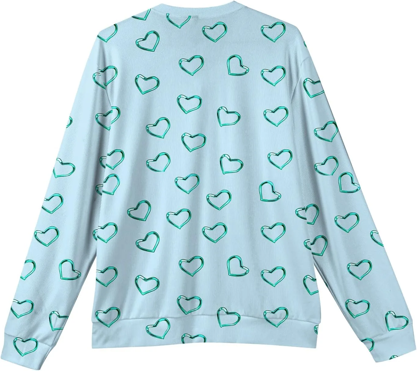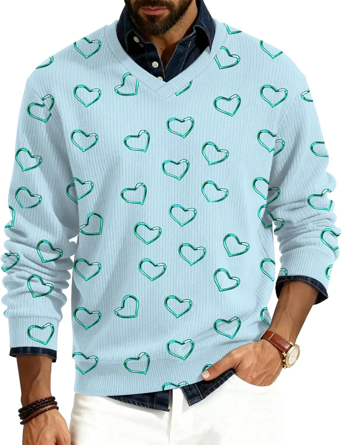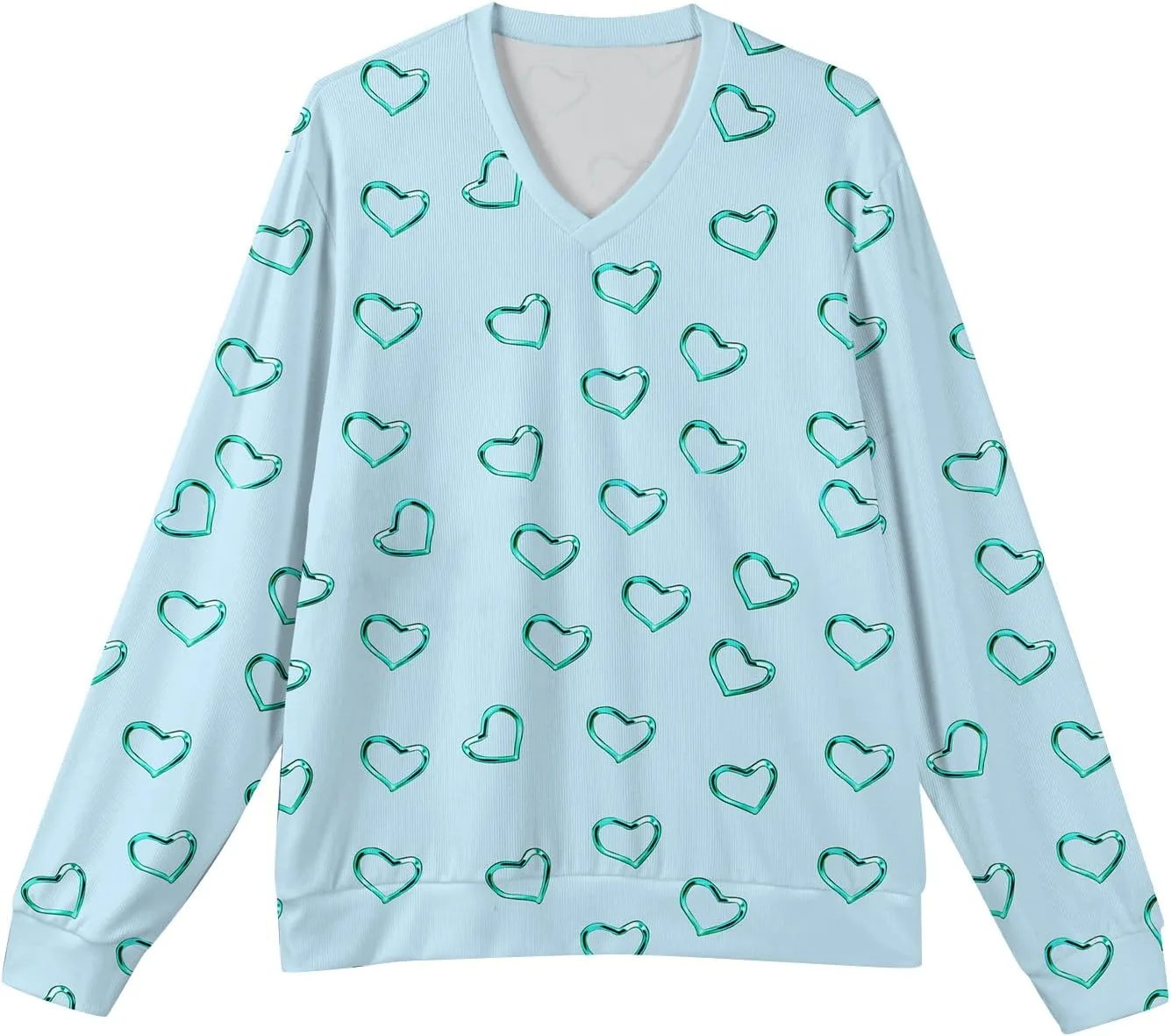 Свитер украшен повторяющимся узором в виде сердечек по всей поверхности и рукавам, что придает ему неповторимый стиль. Узор вплетен в ткань с помощью технологии печати, которая обеспечивает его устойчивость к многократному ношению и стирке.