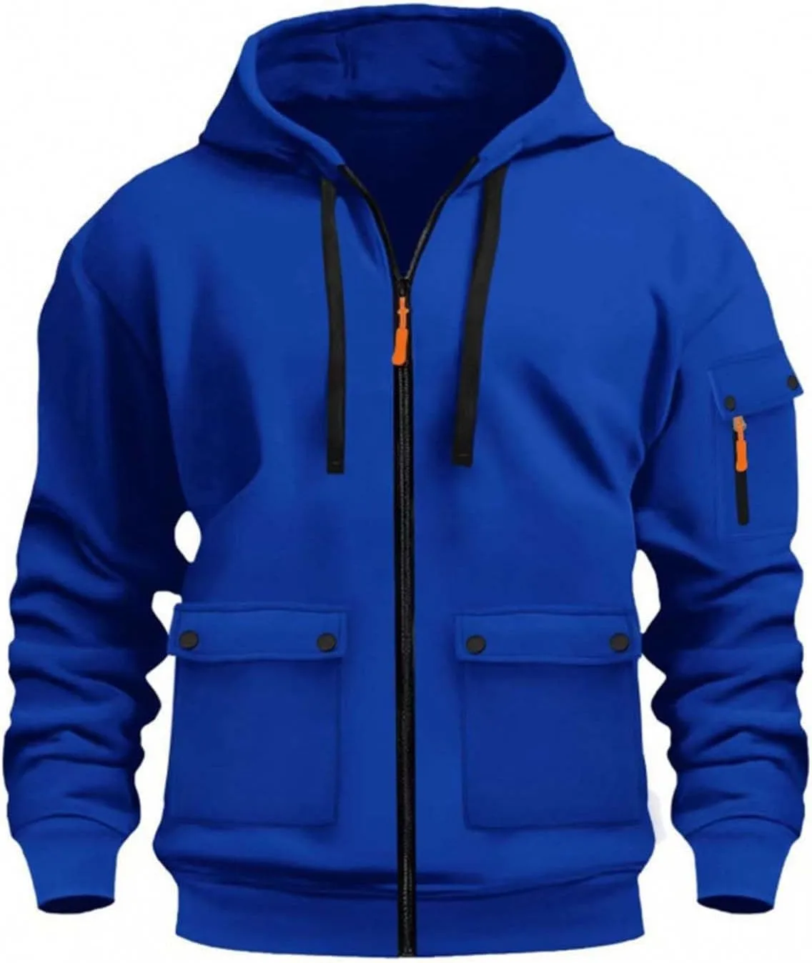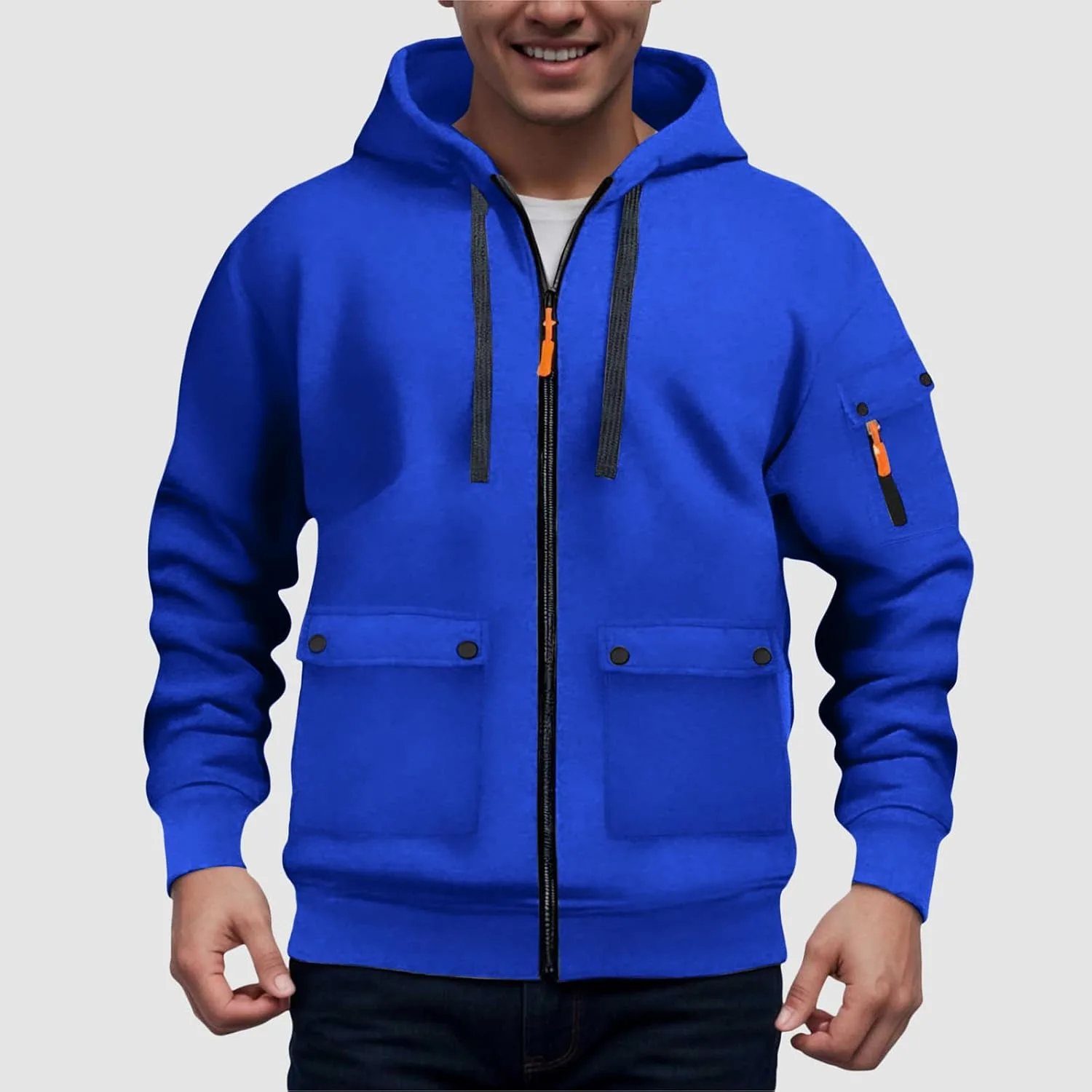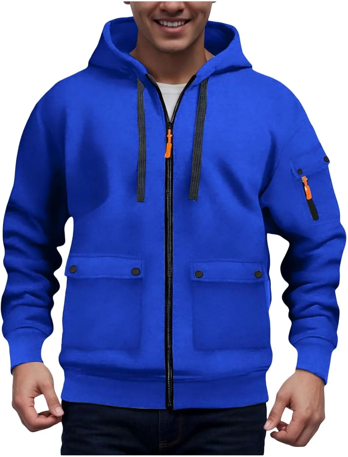 Стильный дизайн: Мужская повседневная флисовая толстовка с длинными рукавами, капюшоном на шнуровке и застежкой-молнией спереди, двумя передними карманами. Достаточно облегающая, чтобы подчеркнуть фигуру, но не стесняющая движений.