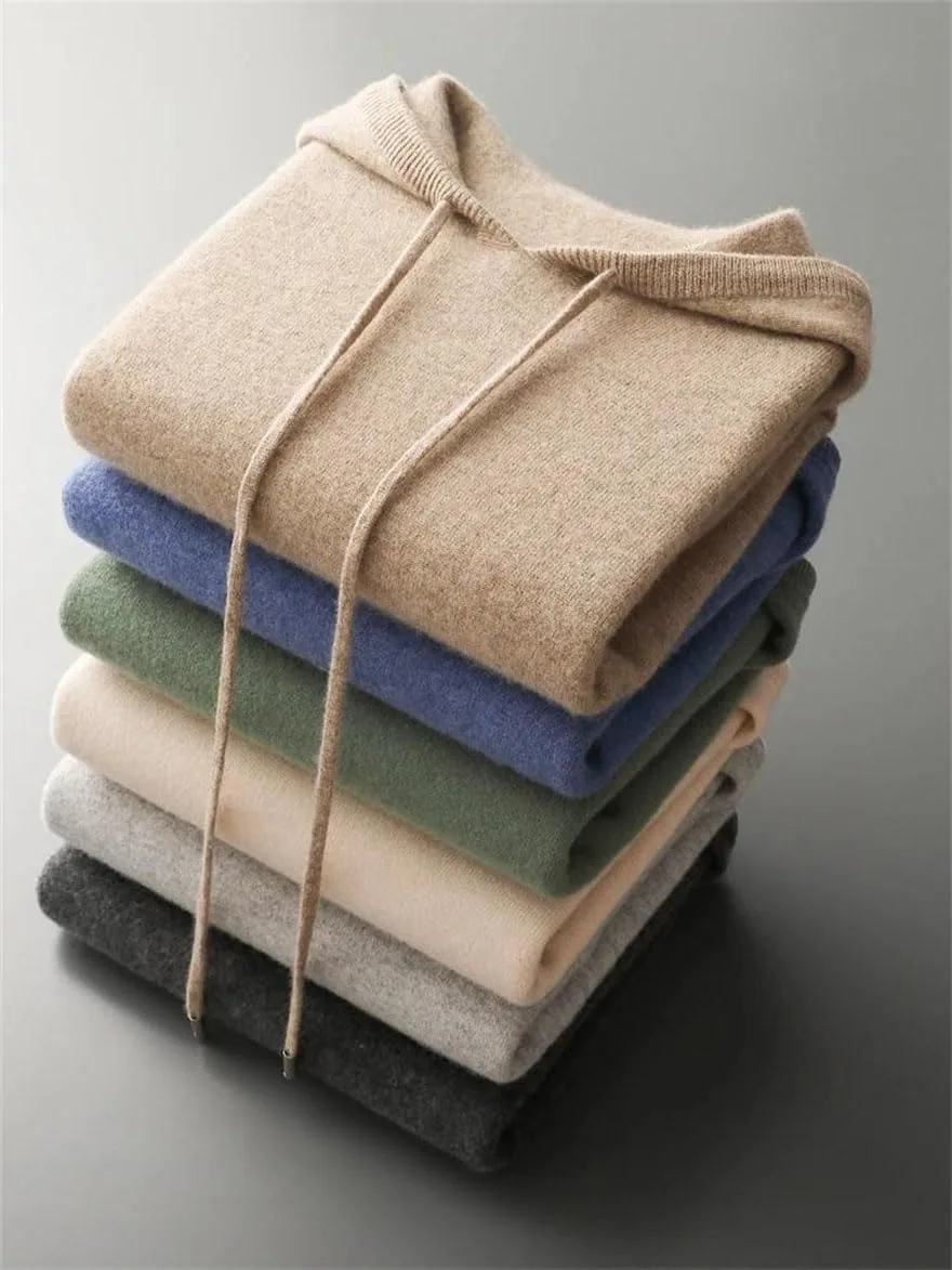 Мужской повседневный кашемировый свитер с капюшоном на шнуровке, регулируемым капюшоном на шнуровке и передним карманом сочетает в себе спортивную эстетику и изысканный деловой стиль, подходящий для различных случаев.