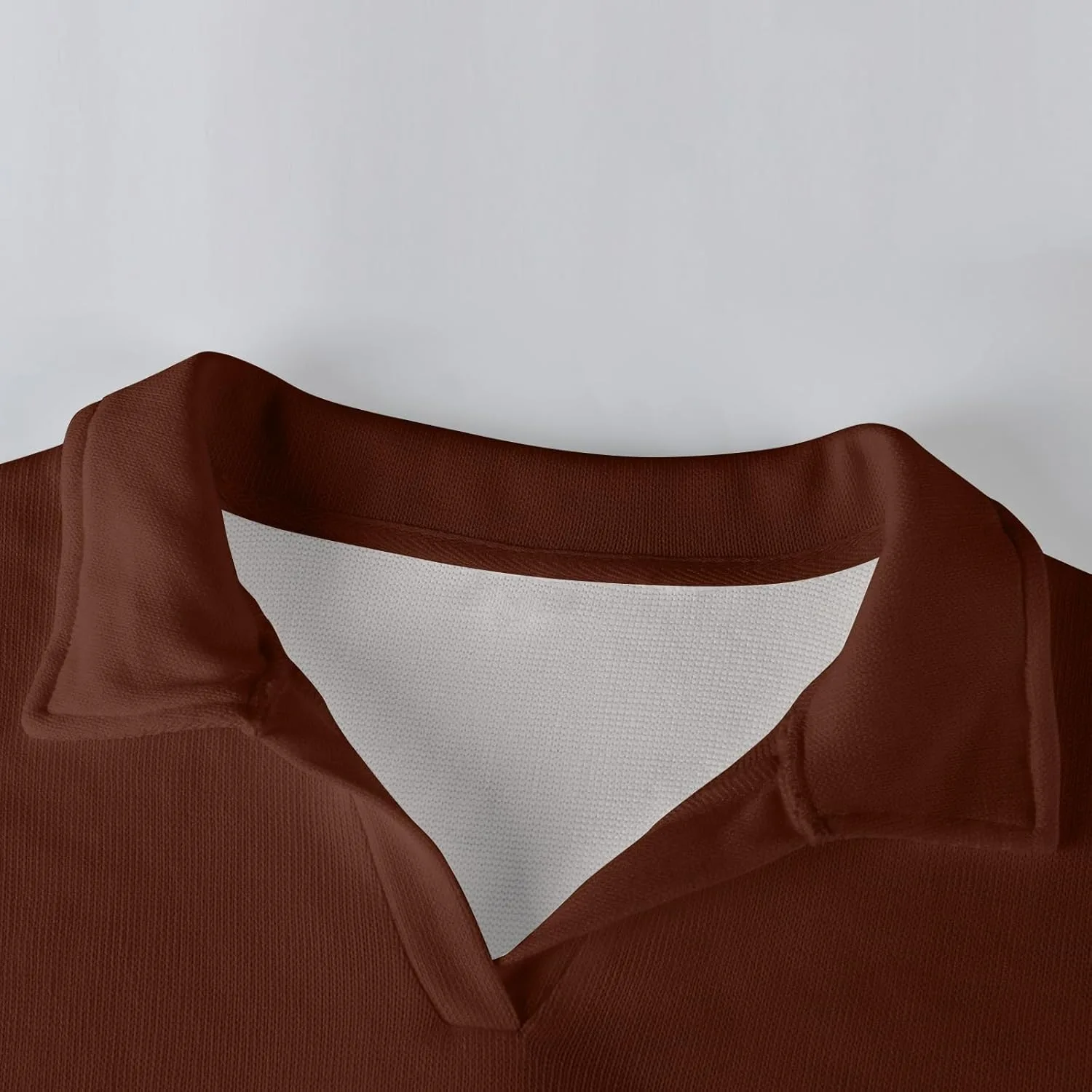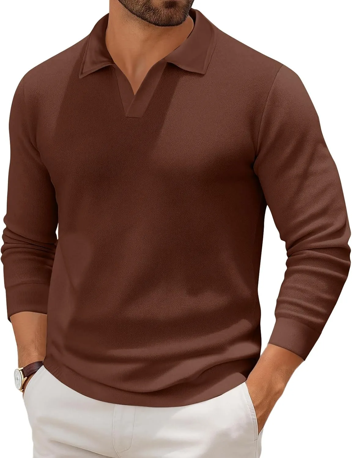 Изысканный воротник-поло и богатая цветовая гамма. Эта мужская футболка с элегантным воротником-поло и V-образным вырезом доступна в таких цветах, как синий, фиолетовый, коричневый, зеленый и других (как показано на изображении). Идеально подходит в качестве мужской футболки с длинным рукавом для случаев в стиле smart-casual или для повседневной элегантности, она поднимает классический стиль футболки на новый уровень.