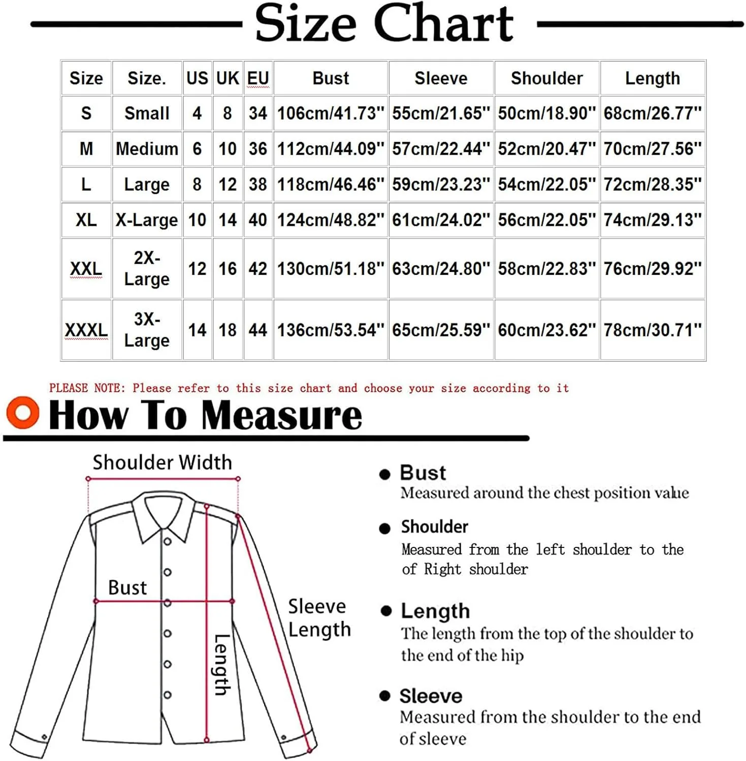 Размер: 3XL США: 14 Великобритания: 18 ЕС: 44 Обхват груди: 136 см/53,54 дюйма Длина рукава: 65 см/25,59 дюйма Ширина плеч: 60 см/23,62 дюйма Длина изделия: 78 см/30,71 дюйма