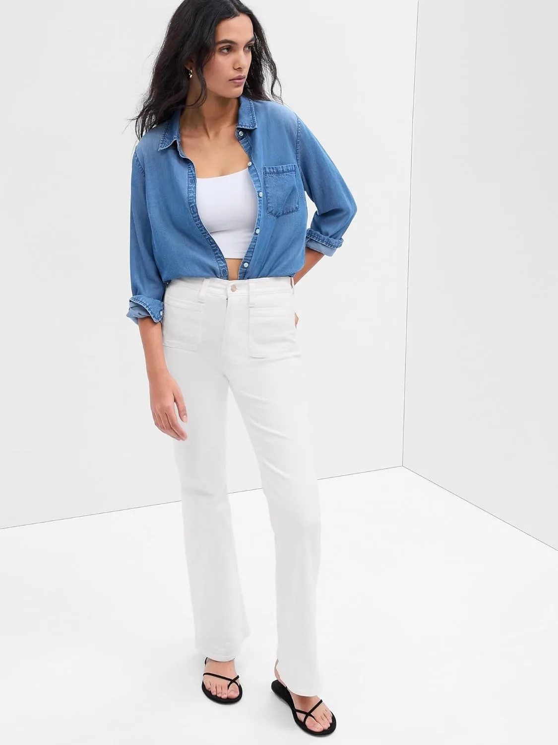Джинсы GAP Women's High Rise Flare Jeans с расклешенными штанинами, идеально облегающие фигуру, привлекают внимание своим смелым дизайном. Они всегда выглядят стильно и непринужденно. Это настоящий деним, созданный на века.