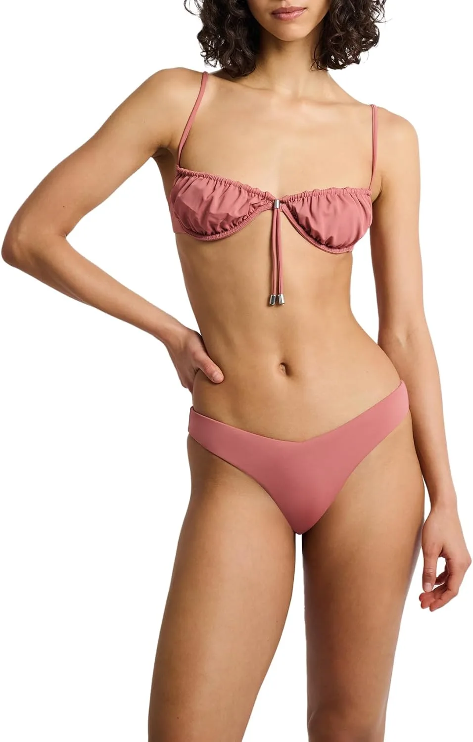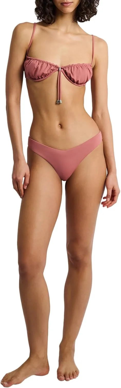 Вшитый шнурок очерчивает край нашего бикини-топа Rose, соединяясь посередине с регулируемой застежкой-боло. Модель на косточках имеет присборенные чашечки, тонкие бретельки и фурнитуру из металлических бусин с выгравированным логотипом Onia.