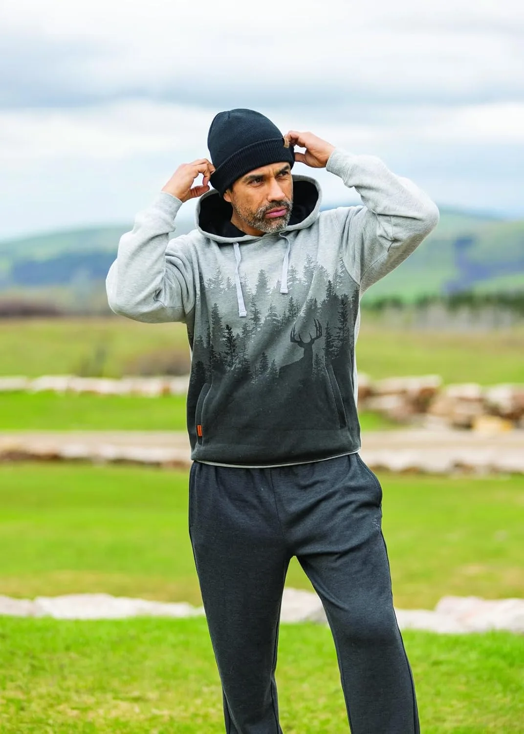 Куртка из кольцевой пряжи с градиентным принтом на лицевой стороне, изображающим пейзаж с белохвостым оленем на фоне леса.