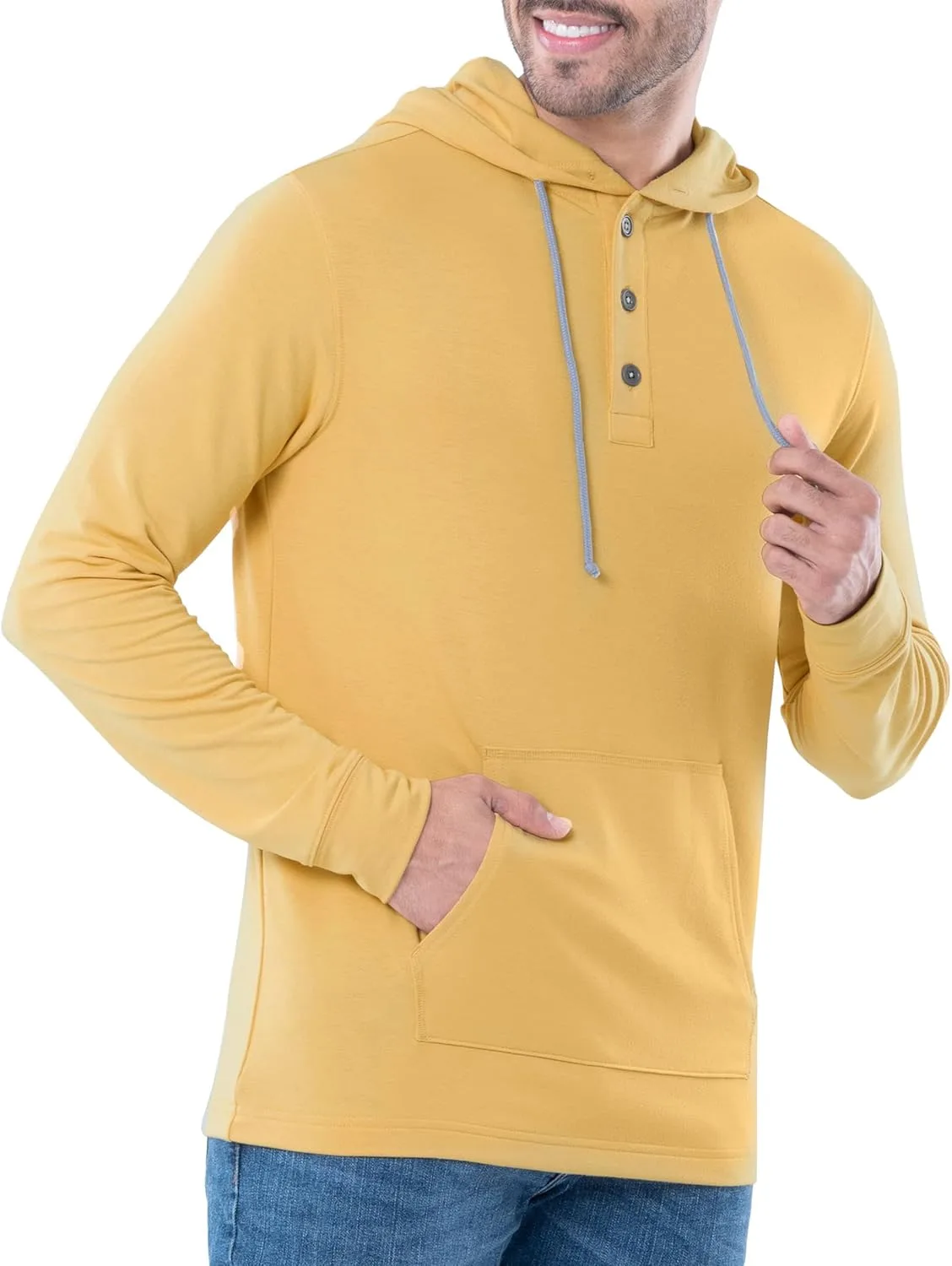 Классическая толстовка с капюшоном и шнурками для регулировки размера — не слишком обтягивающая и не слишком свободная.