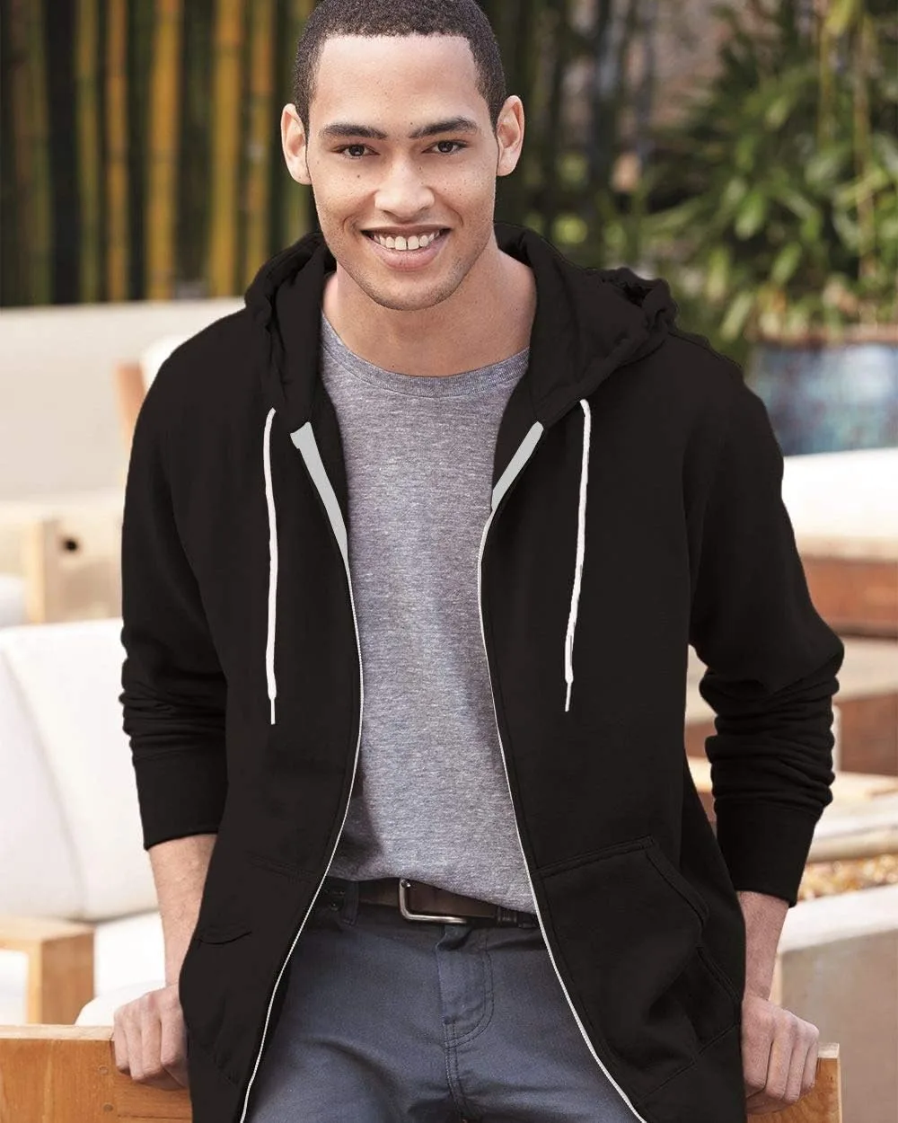 Трикотажная резинка 1x1 на манжетах, поясе и краях карманов. Раздельный карман-кенгуру. Отрывная этикетка.