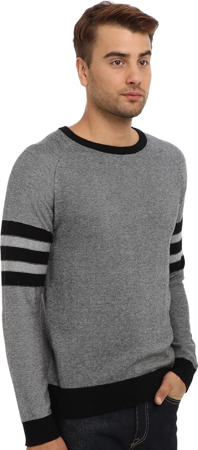 Пуловер с круглым вырезом, полосками на середине рукава, ребристыми манжетами, воротником и нижним краем контрастного цвета.