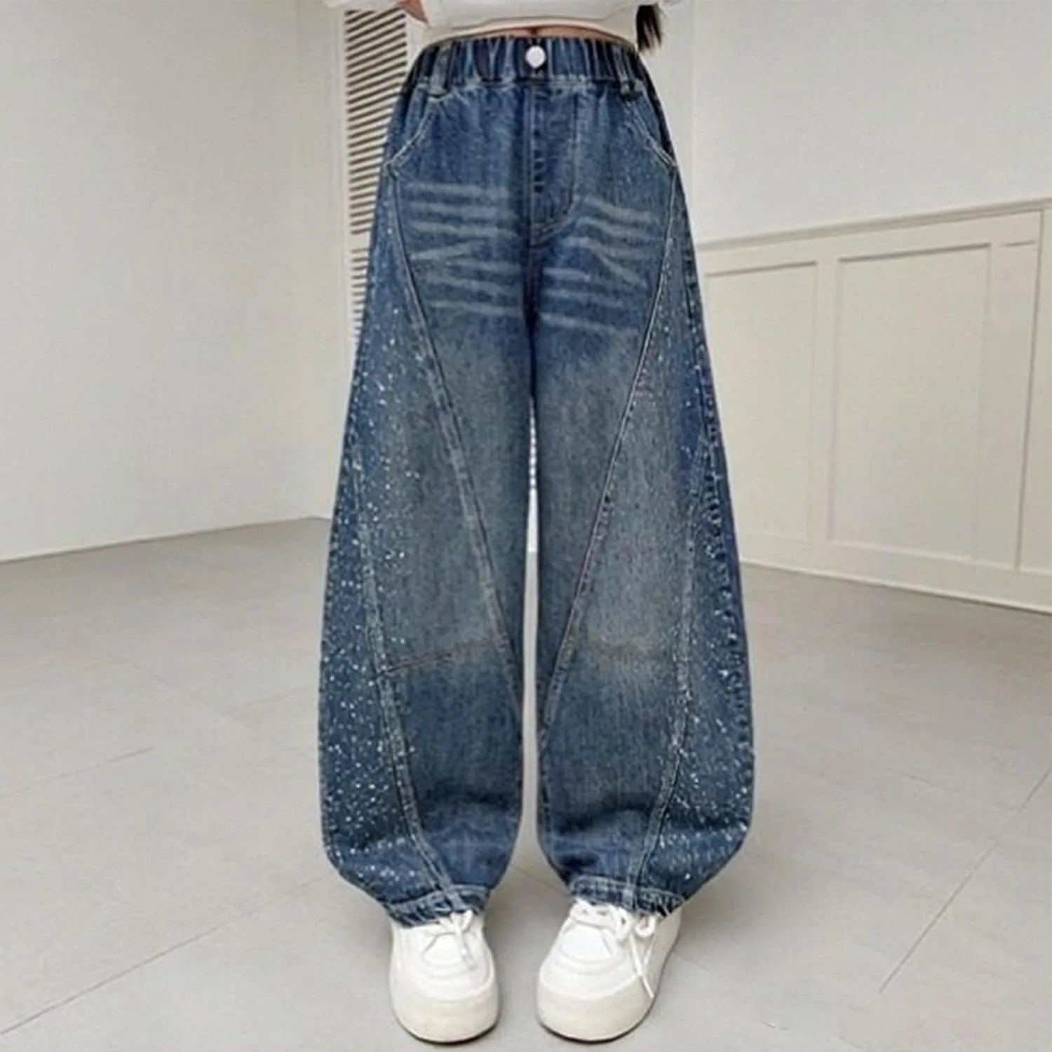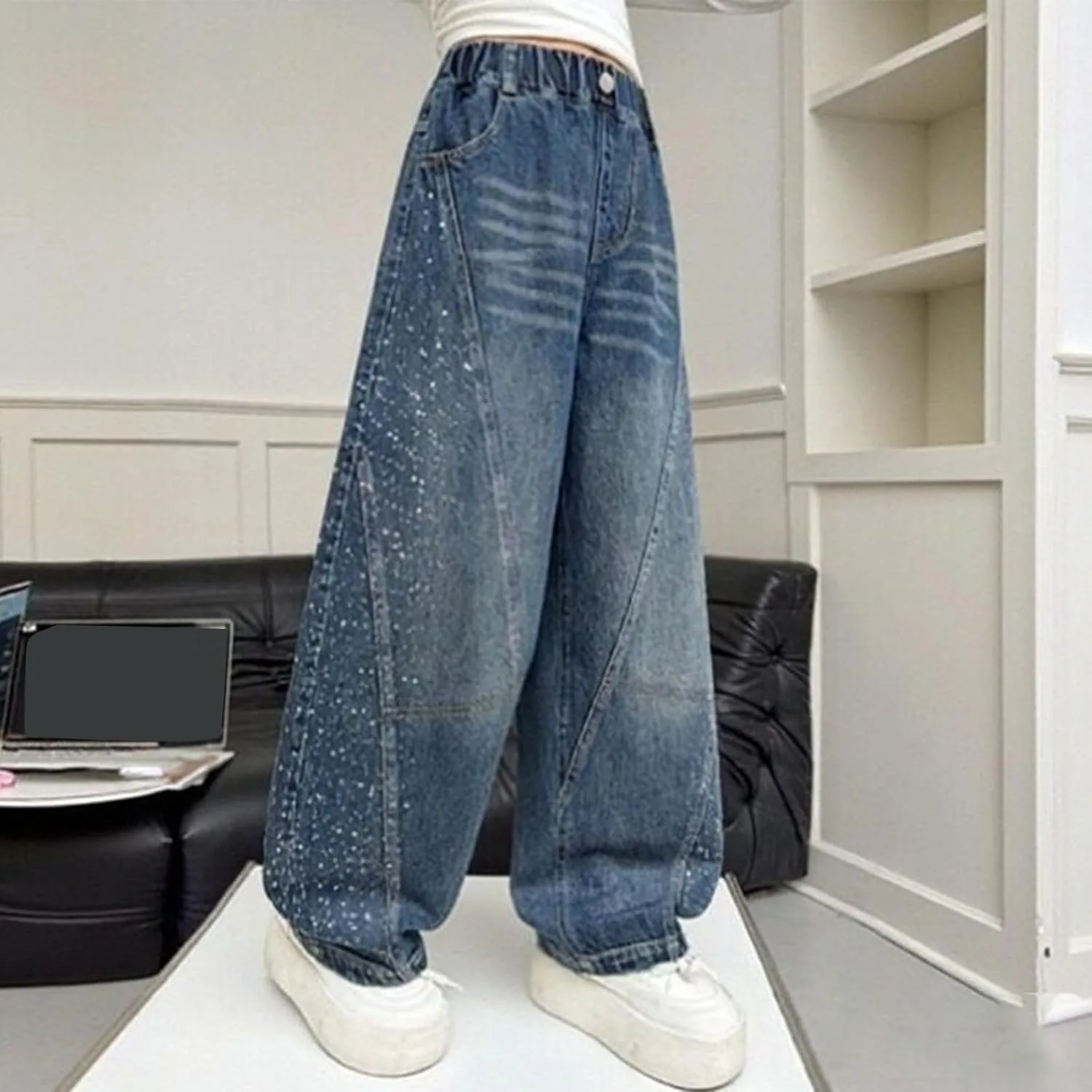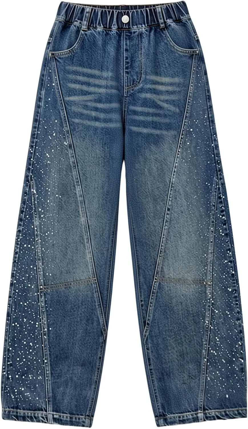Материал: Эластичная джинсовая ткань с мягкой текстурой для комфорта движений. Дизайн: высокая талия и широкие штанины для создания образа в стиле стритвеар 2000-х. Особенность: Эластичный пояс позволяет легко надевать брюки без застежек. Повод: Подходит для повседневной носки, школьных экскурсий или мероприятий на выходных для подростков. Уход: Машинная стирка в холодной воде, вывернув наизнанку, сушка в сушилке при низкой температуре.