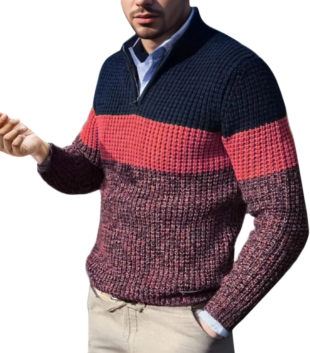 Дизайн в полоску и с цветовыми блоками: смелые полосатые узоры в сочетании с цветовыми блоками (например, серый + синий, черный + белый) придают свитеру модный вид, выделяя его на фоне обычных вязаных изделий. Дизайн подходит для повседневных и полуповседневных образов.