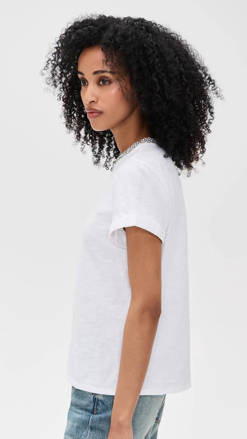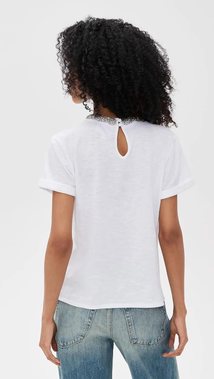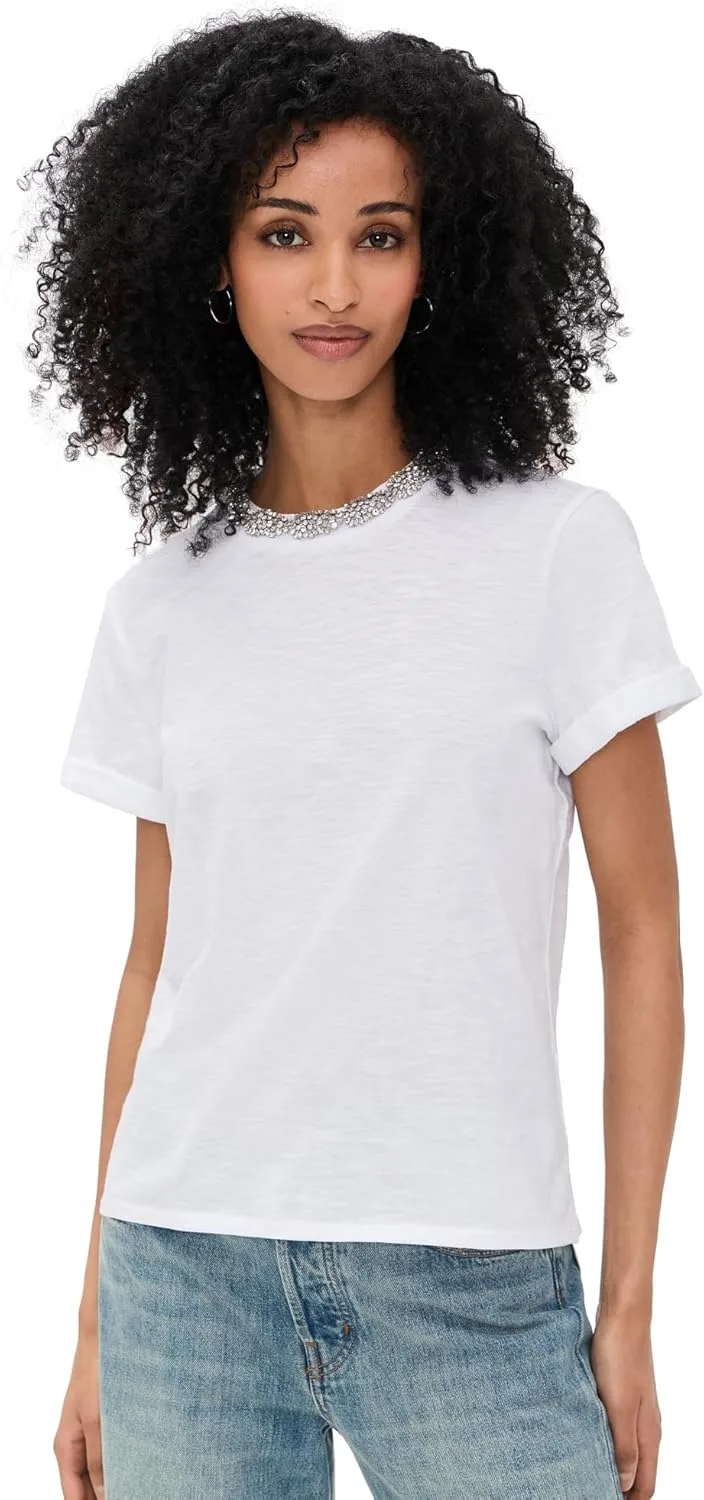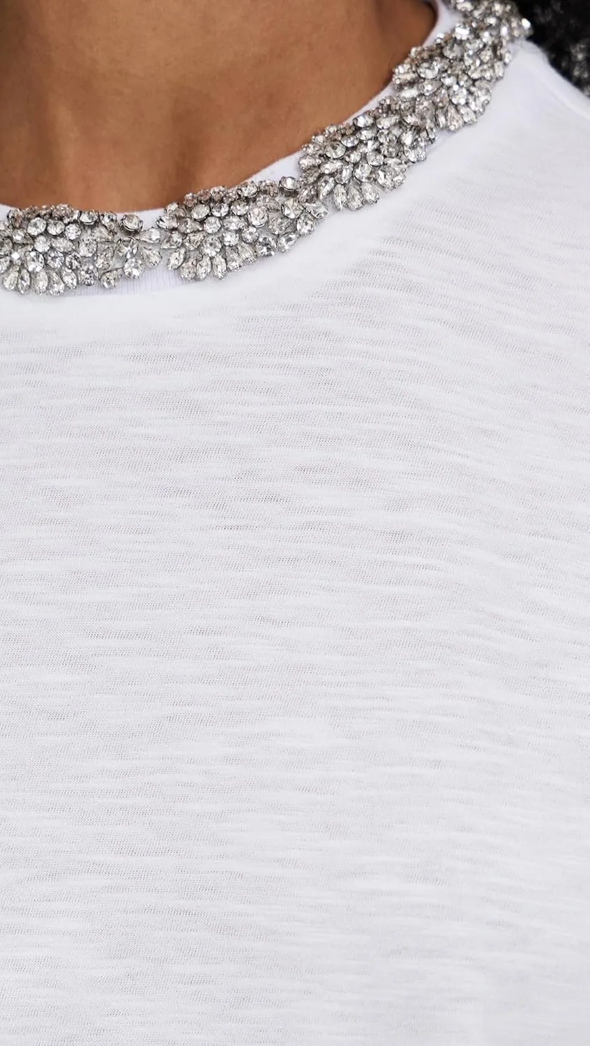 Футболка Crystal Garden Bree Tee — это изысканная белая хлопковая футболка с ноткой элегантности. Вышитый бисером воротник добавляет тонкую, но эффектную деталь, а манжеты на рукавах завершают этот непринужденно шикарный дизайн. Идеальное сочетание повседневного комфорта и утонченного стиля.