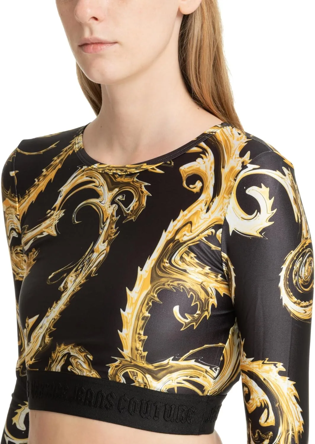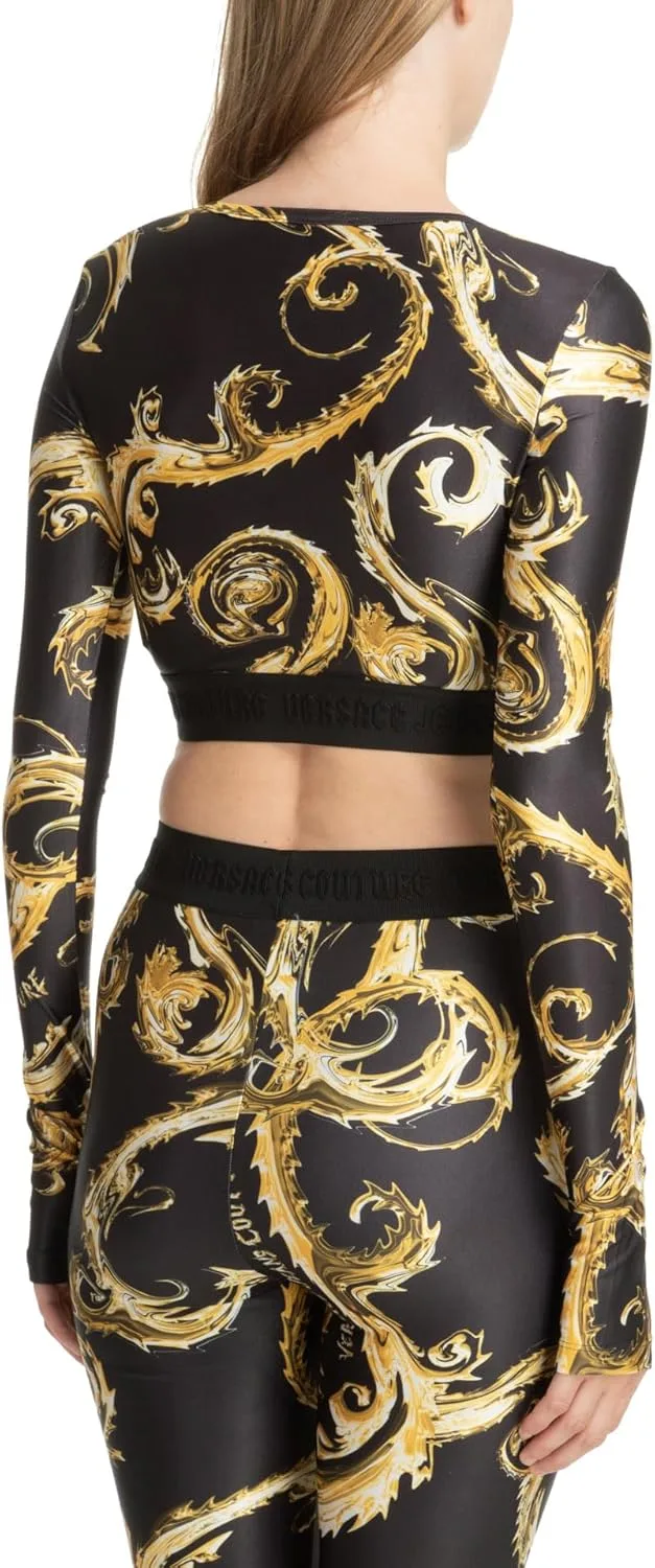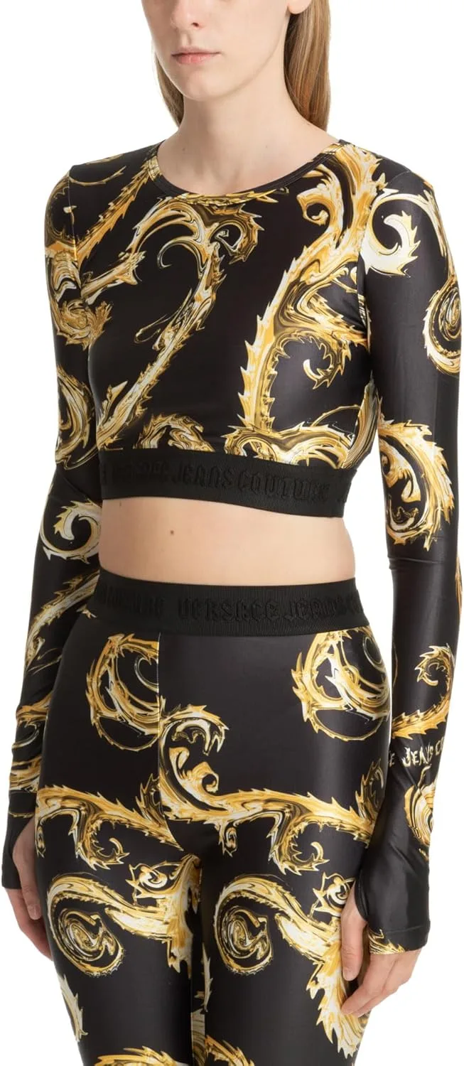 Произведите фурор с этим эффектным черно-золотым укороченным топом, украшенным роскошным принтом в стиле барокко. Созданный для модниц, этот топ с длинными рукавами сочетает в себе элегантность и спортивный стиль, а эластичный край с логотипом бренда обеспечивает надежную и привлекательную посадку.