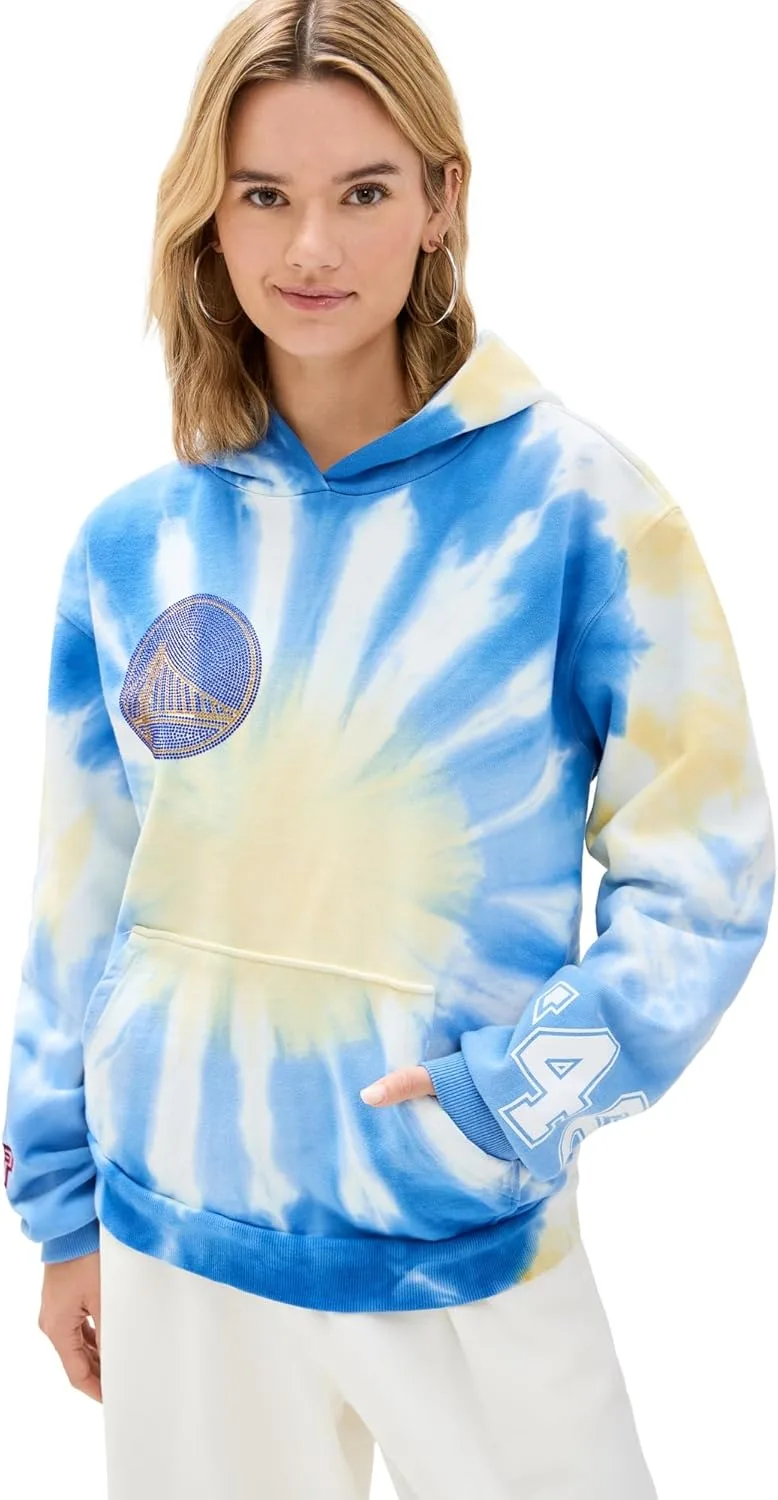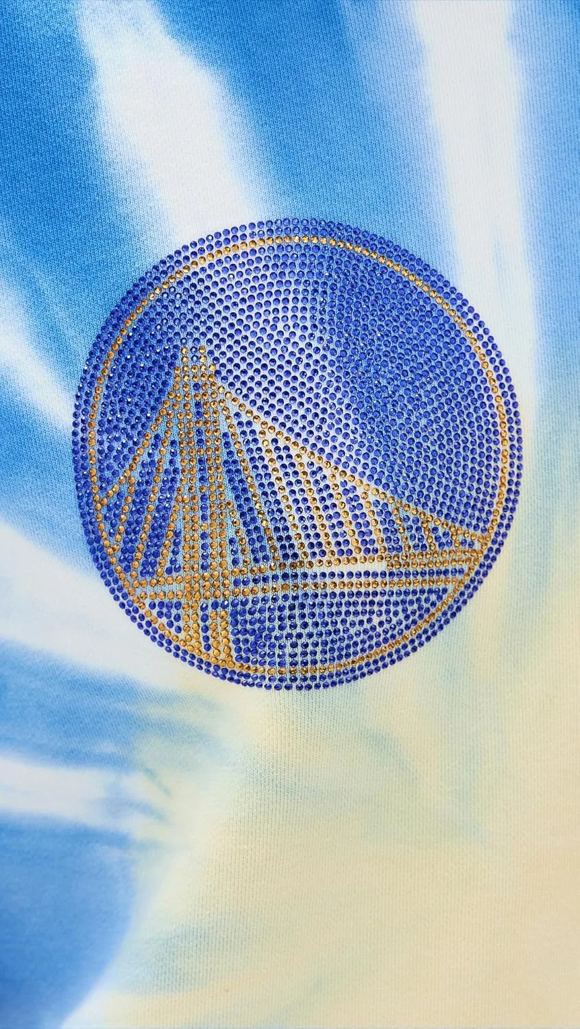 Надпись «Warriors» на спине, логотип, украшенный кристаллами, на груди, принт в стиле тай-дай.
