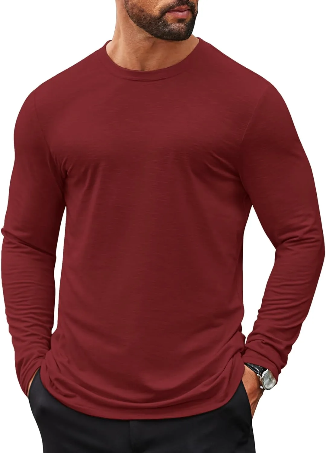 Простая футболка: Мужская футболка с длинным рукавом изготовлена из фактурной ткани, однотонная, повседневная, с круглым вырезом, простая и стильная.