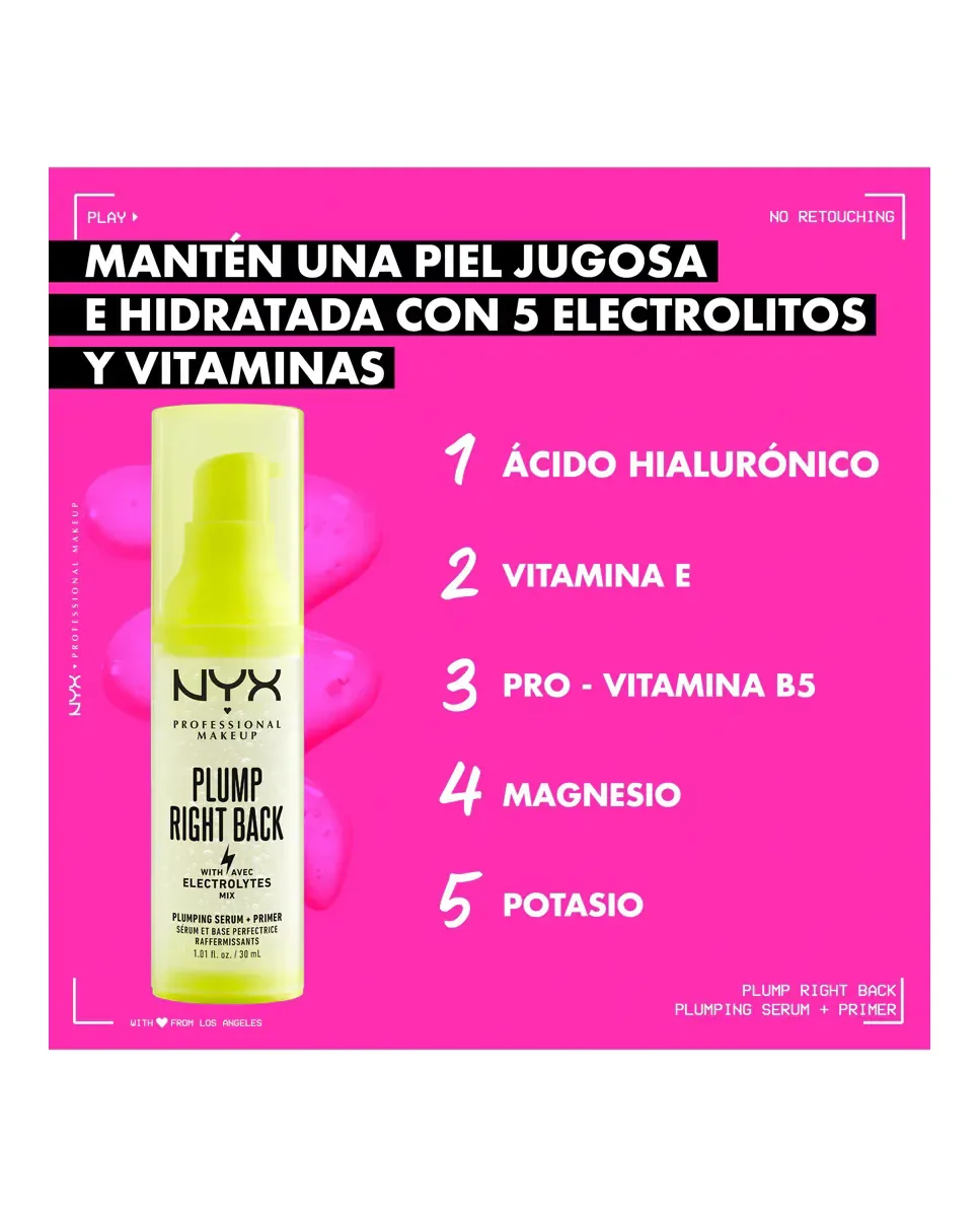 Сыворотка и праймер Plump Right Back от NYX Professional Makeup - это продукт с веганской формулой, который обеспечивает увлажнение и энергией кожу. Содержит гиалуроновую кислоту и смесь витаминов, включая E и B5, а также минералы, такие как магний и калий, которые способствуют ощущению свежести и благополучия. Этот праймер подготавливает кожу к макияжу и помогает продлить его стойкость до 24 часов. Рекомендуется наносить количество размером с монету на чистую кожу, используя аппликатор для обеспечения равномерного распределения и впитывания.