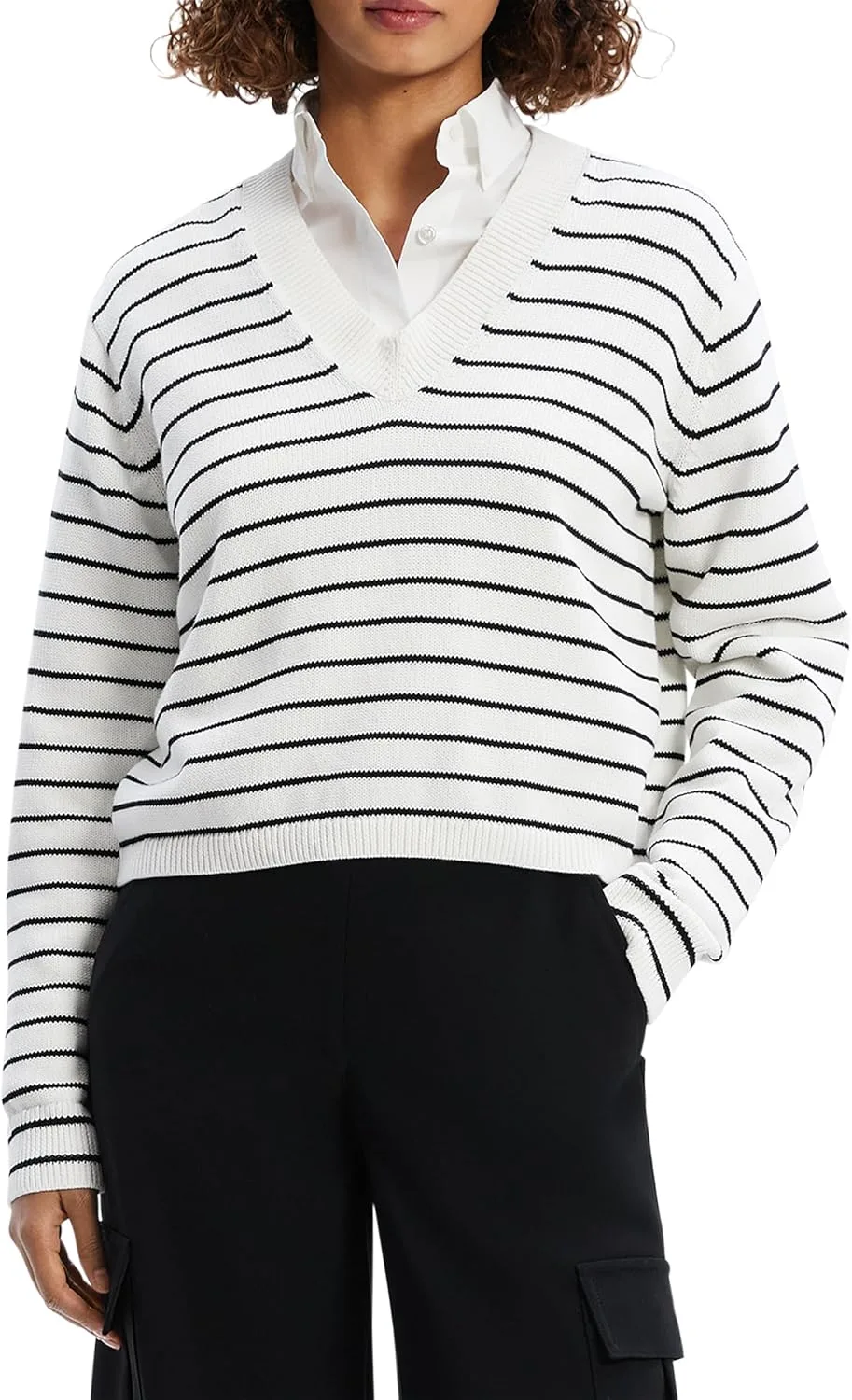 Укороченная футболка в полоску с V-образным вырезом и узкими рукавами.