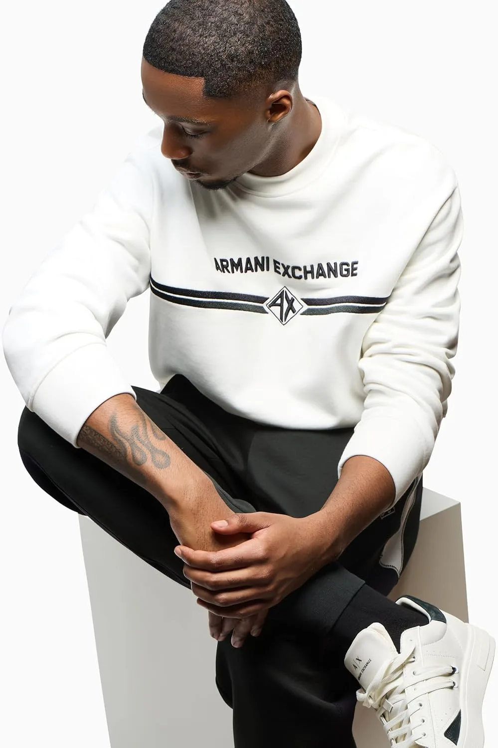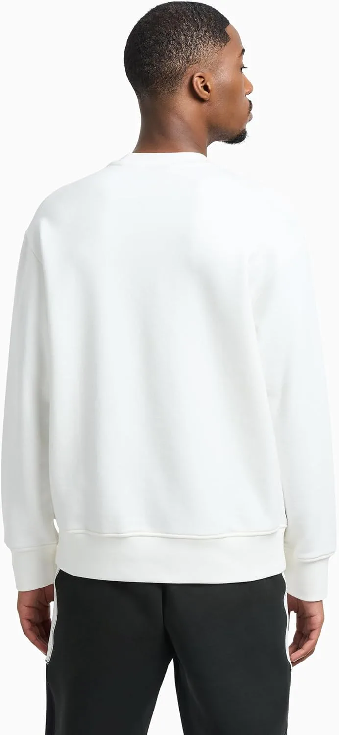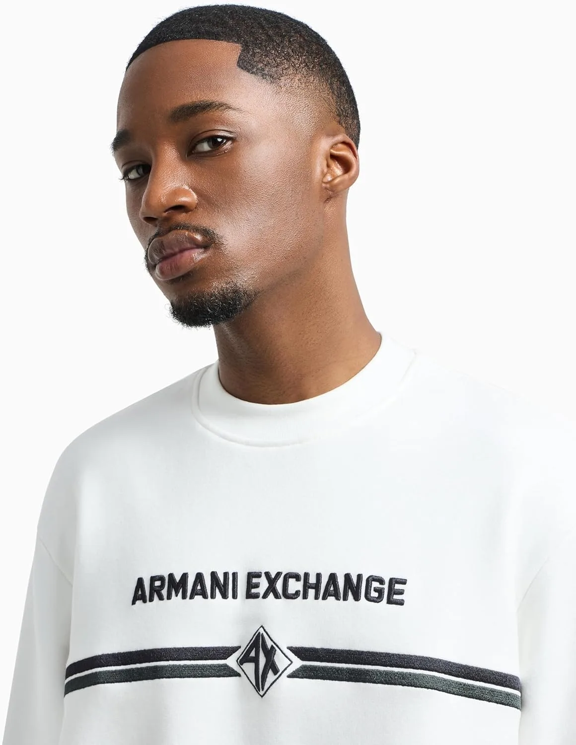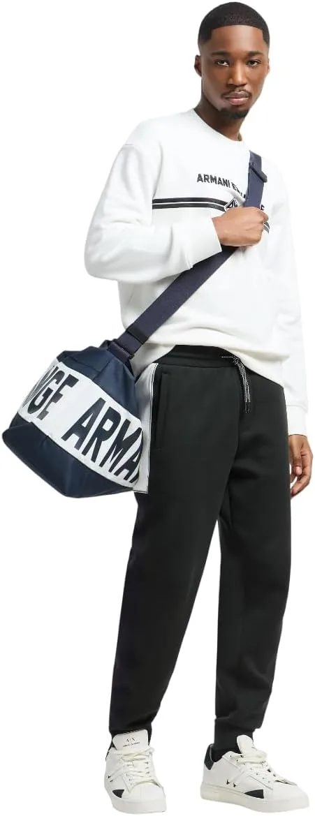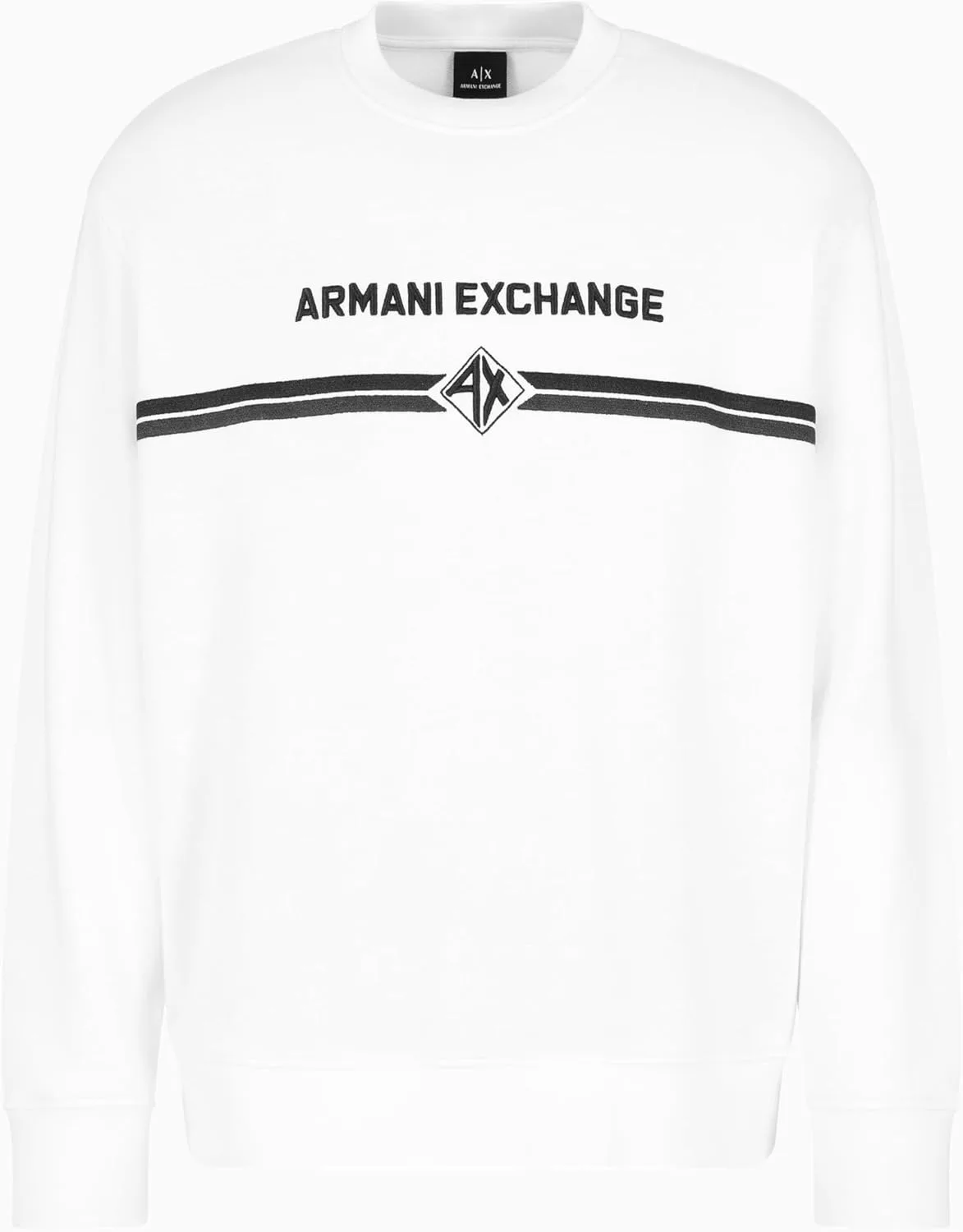 Эта мужская толстовка Armani Exchange с круглым вырезом украшена двумя горизонтальными линиями и небольшим ромбовидным логотипом с надписью AX внутри ромба. На передней части толстовки также имеется крупная простая надпись Armani Exchange.