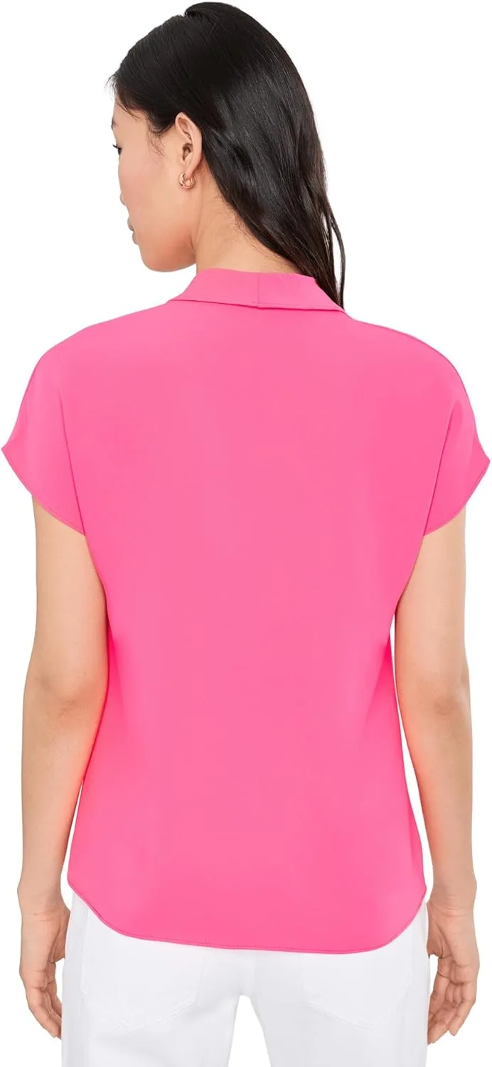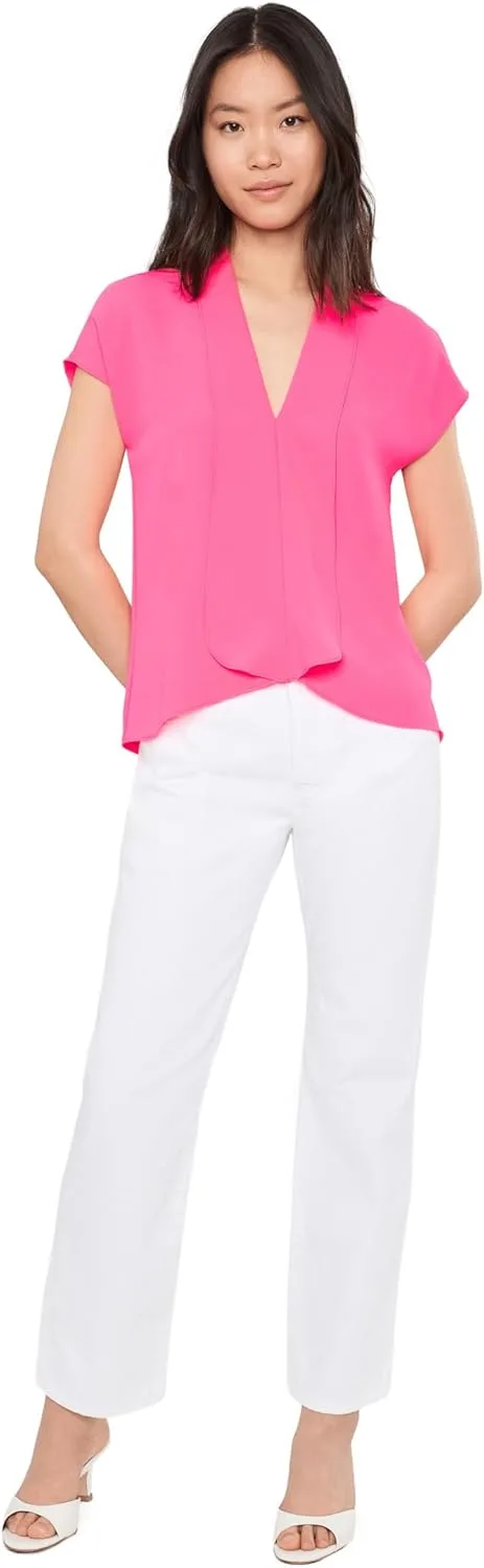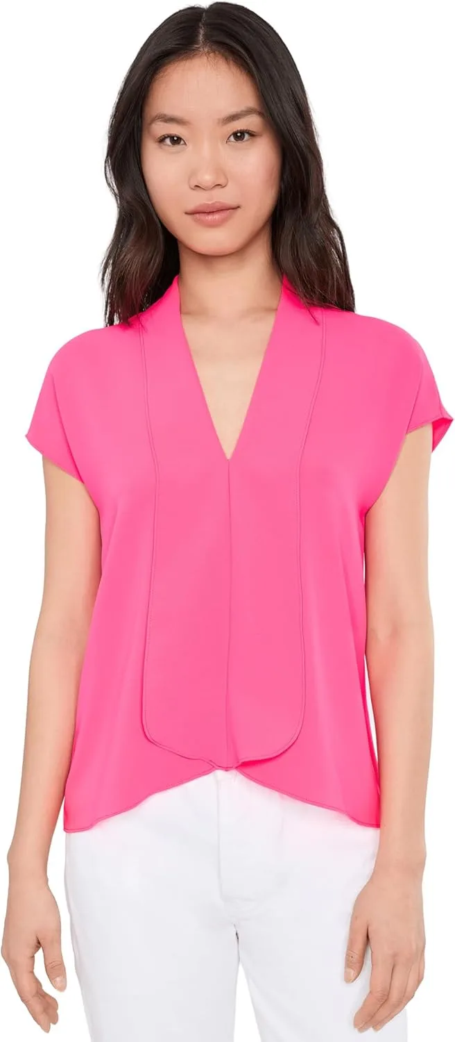 Эта блузка с короткими рукавами и V-образным вырезом имеет свободный крой и переднюю накладку, которая ниспадает по центру.