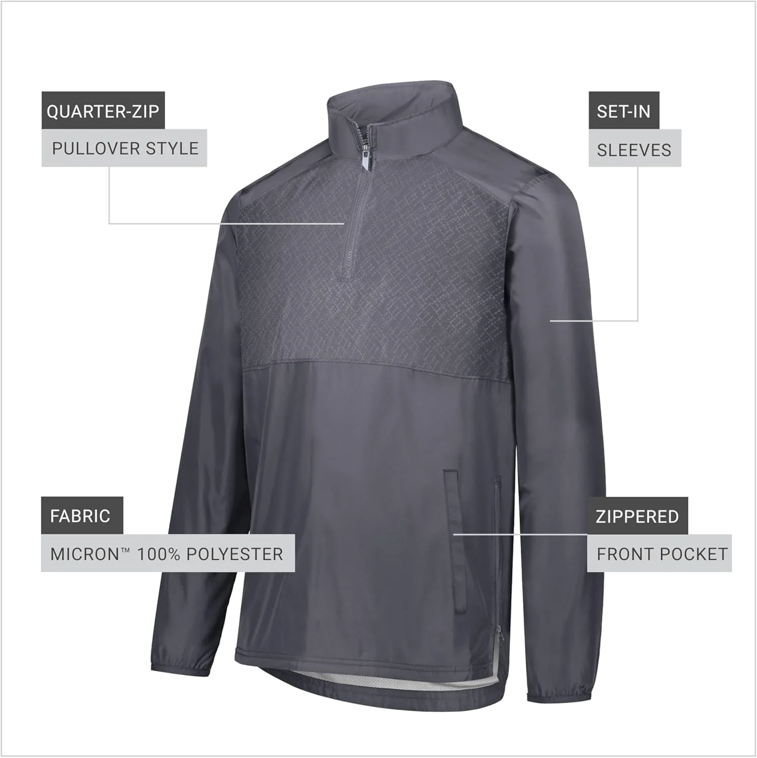 Полиэстер микрон — это легкая, ветро- и водонепроницаемая ткань. Корпус из нейлона с подкладкой из микросетки, рукава с подкладкой из тафты. Тканевая этикетка, пуловер на молнии до середины груди с защитным клапаном для молнии. Втачные рукава, передние карманы, манжеты с отделкой из спандекса. Застежка-молния в боковом шве для удобства надевания и снимания, удлиненная задняя часть с боковыми разрезами.