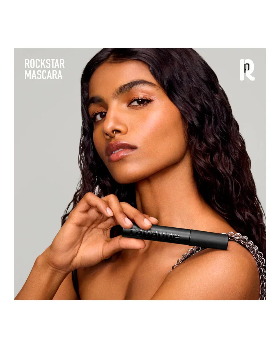 Тушь для ресниц Rockstar от Rabanne подчеркивает взгляд с заметным объемом, обеспечивая на 220% больше объема благодаря своей ультра-насыщенной и легко регулируемой формуле, которая не ощущается тяжести. Имеет интенсивный черный цвет и коническую щеточку, которая позволяет создать смелый взгляд. Этот продукт веганский и содержит 94% натуральных ингредиентов, включая касторовое масло. Щеточка содержит более 600 волокон, обеспечивая, что каждая ресница получает правильное количество продукта и покрывая все углы для равномерного результата. Его эффективность была проверена в тестах с участием потребителей, гарантируя комфорт на протяжении 24 часов.
